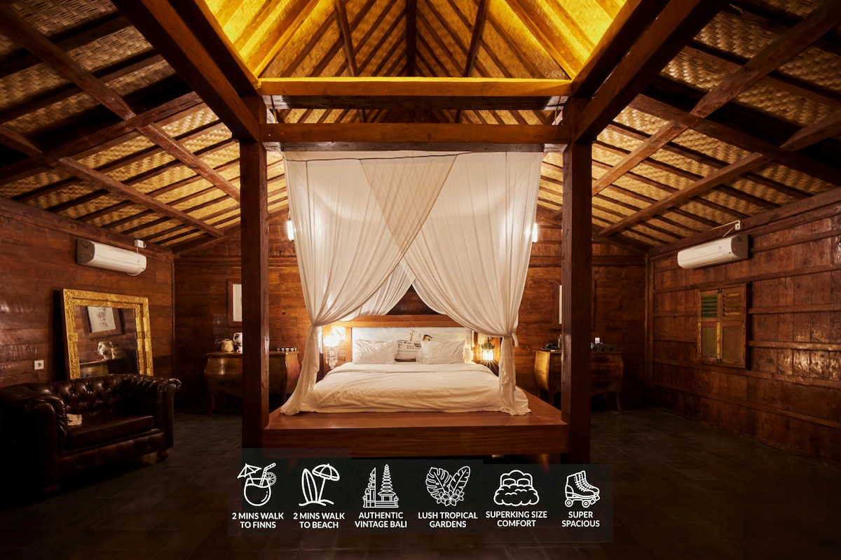 Huge Authentic Balinese wooden house on top of a brick castle. A rare find in Bali, offering spaciousness, charm, & privacy. Lush gardens minutes from Berawa Surf Beach, Finns & Atlas Clubs & Restaurants. King size bedroom/lounge with ensuite, balcony, and TV, perfect for work or leisure. Downstairs, a shared kitchen, dining, and lounge area. Sprawling gardens over 500 sqm and a 10-meter pool. Other Spaces airbnb.ca/h/Joglo1 airbnb.ca/h/joglo2 airbnb.ca/h/duajoglos airbnb.ca/h/wholevilla