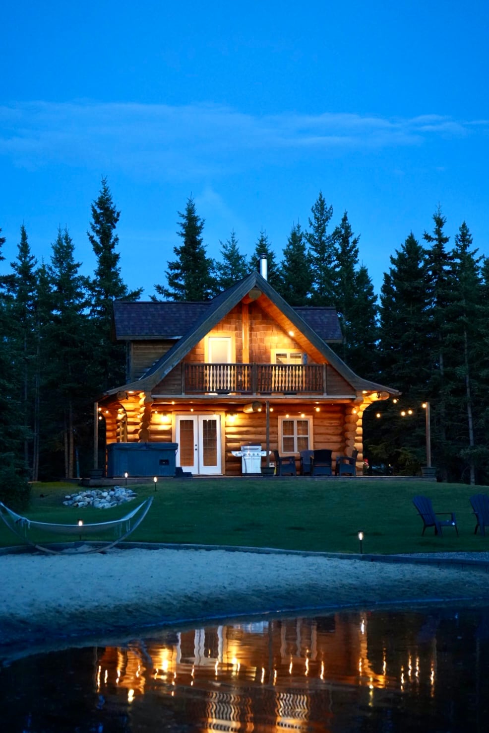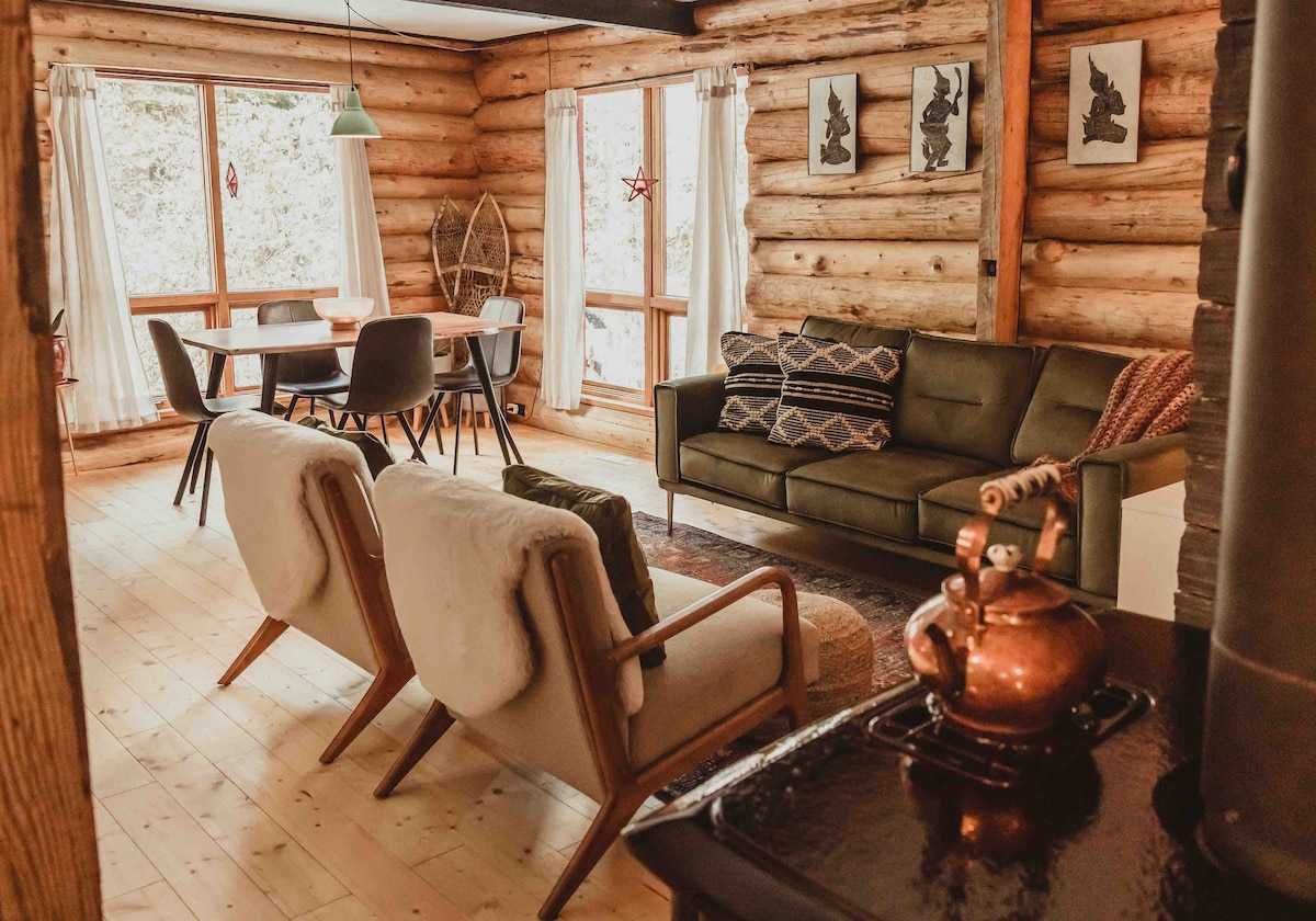 Deze dromerige blokhut is de perfecte plek om je lichte zomers (met airconditioning) en gezellige winters (houtkachel) door te brengen! De benedenverdieping beschikt over vloerverwarming met de woonkamer bij de houtkachel, een slaapkamer, badkamer, keuken en eetkamer. Boven vind je de hoofdslaapkamer en ensuite met een studeerkamer die naar het balkon leidt. De hut ligt in de bomen van de wijk Grande Haven met een groot terras en een bubbelbad met uitzicht op de gedeelde vijver om te zwemmen en te schaatsen.