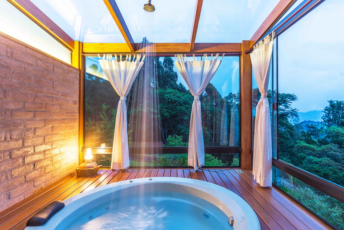 Chalet nas Nuvens (op slechts 20 minuten van het centrum van São Bento) ligt op een van de hoogste bergen in São Bento (op slechts 20 minuten van het centrum van São Bento) een luxe glazen berghuis met exclusieve paden, een boerderij met dieren, een bubbelbad, duizenden fruitbomen, een bbq, terras met de mooiste zonsondergang in de regio, een open haard, vuurkorven en het hele jaar door uitzicht op het Serra da Mantiqueira-gebergte. We noemen het graag 'hemel op aarde'.