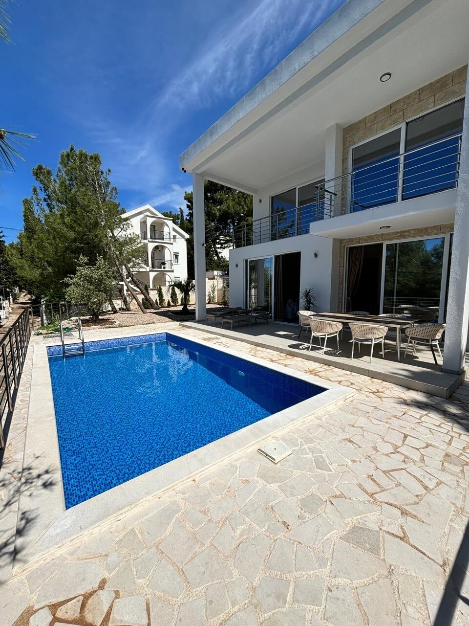 Escape to SeiSensi, a luxurious 3-level beachfront villa near Bar with direct beach access and stunning sunset views. Perfect for up to 14 guests, this exclusive retreat features a private heated infinity pool, elegant en-suite bedrooms, and spacious lounge areas. Experience ultimate seaside elegance and comfort by the Adriatic Sea. Three parking spaces. WIFI, AC and underfloor heating. The best Luxury Beachfront Villa in Montenegro.