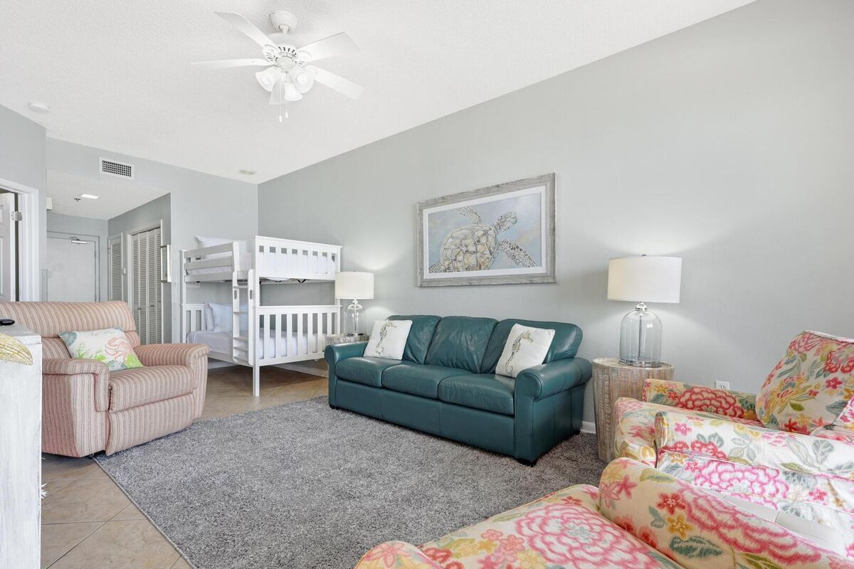 Beautiful 1/1 with built-in bunks directly on the Gulf of Mexico within walking distance to restaurants. Orange Beach is a very laid back safe area with beautiful beaches and lots to do. Our unit sleeps 6 and is fully furnished, all cookware, dishes, keyless entry, Alexa, WiFi, Indoor Heated Pool with Hot Tub, Gym with Sauna, Outdoor Pool, several BBQ grills, plenty of parking, elevator, and lobby with 24 Hour Security. Master has a Queen Bed, Hallway has built-in bunks and a fold-out couch.