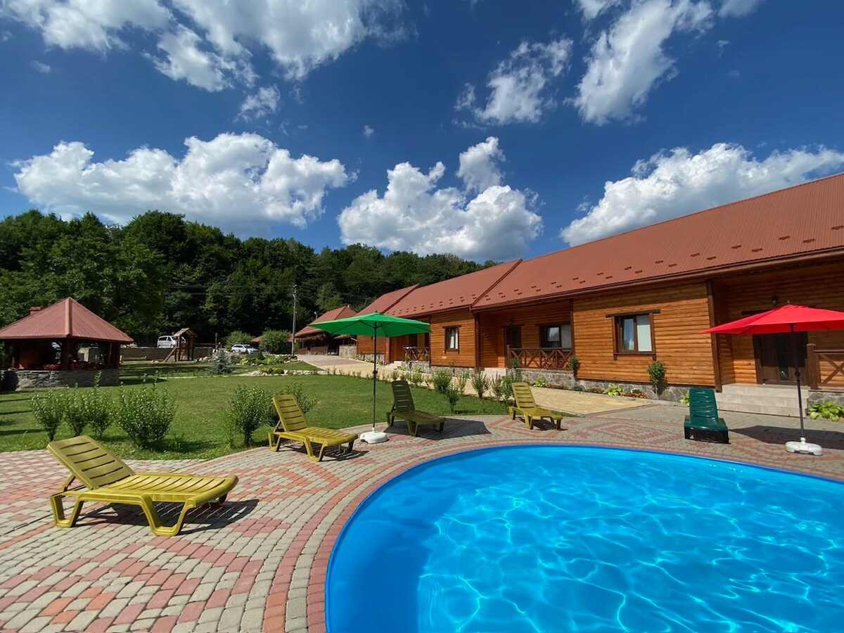 Welkom bij het Mountain House. Dit is een van de twee huizen die beschikbaar zijn om in de ruimte te reserveren. De zithoek is 54 m². Er is een ruim terras – 20 m² met toegang tot de persoonlijke grillruimte. Het huis 'Mountains' is ontworpen voor 6 personen. Gebouwd met hoogwaardige milieuvriendelijke materialen op frametechnologie. Uitzicht op de bergen, twee eigen slaapkamers, houtkachel, groot terras, keuken. De prijs is inclusief: gebruik van het verwarmde zwembad, groot prieel met grill, speeltuin. Er is een extra vat.