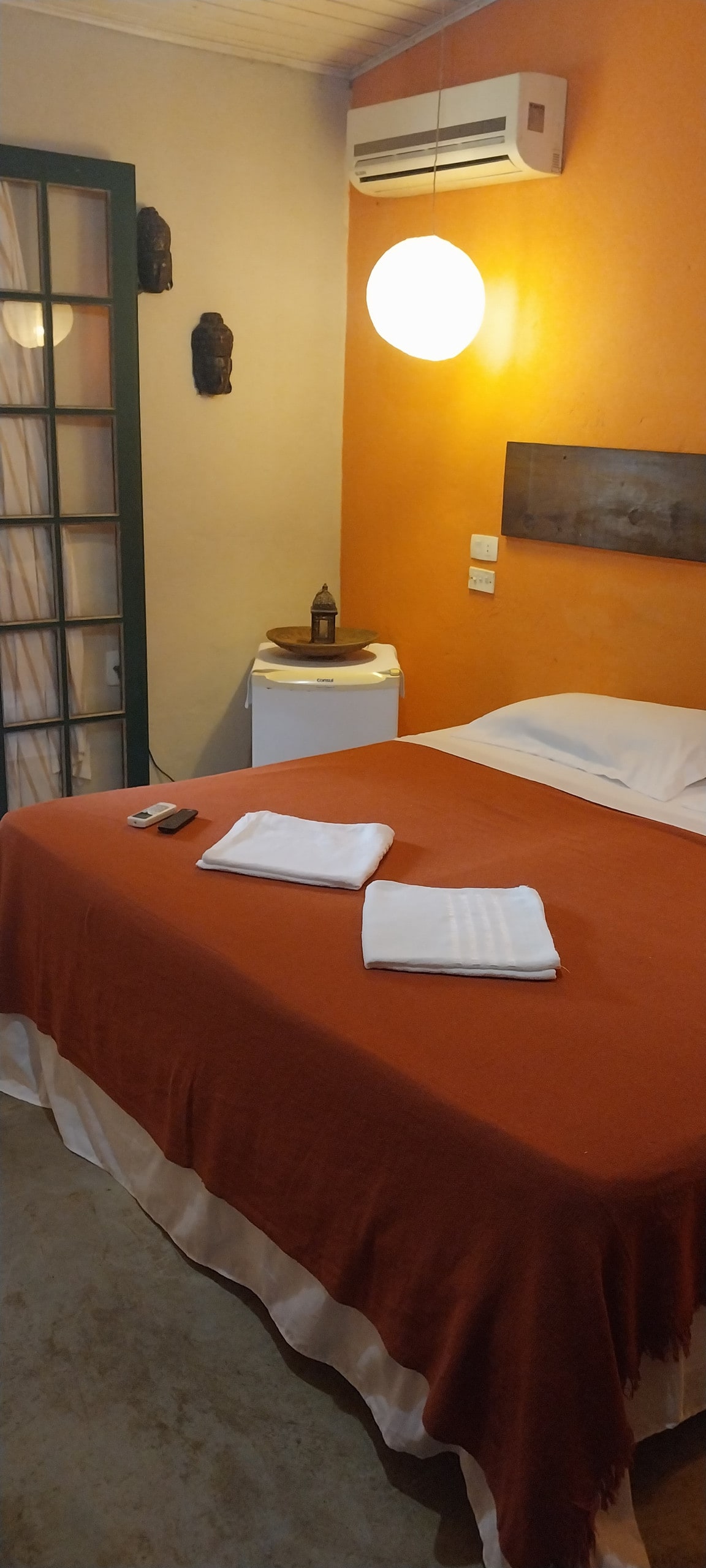 Equipado com 1 cama de casal e 1 cama de solteiro, o quarto possui ar-condicionado, TV de LED, frigobar, ventilador, guarda-roupas ou armário, enxoval completo e banheiro privativo com ducha. Acomoda até 3 pessoas.