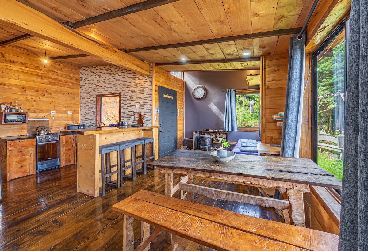 Ontspan, ontspan en kalmeer met een prachtig uitzicht op Dragon Lair. De kleine rustieke bamboehut heeft een groot kingsize bed met de beste nachten en uitzicht op het wakker worden. Een dubbele bank om gewoon te zitten, je benen te strekken en te schitteren in de verte waar je op heldere dagen de Stille Oceaan kunt spotten. 's Nachts kun je de gashaard aansteken om op te warmen voordat je in het warme bed glijdt! Het is hier 's nachts erg koud en soms winderig, maar overdag zijn de temperaturen perfect.