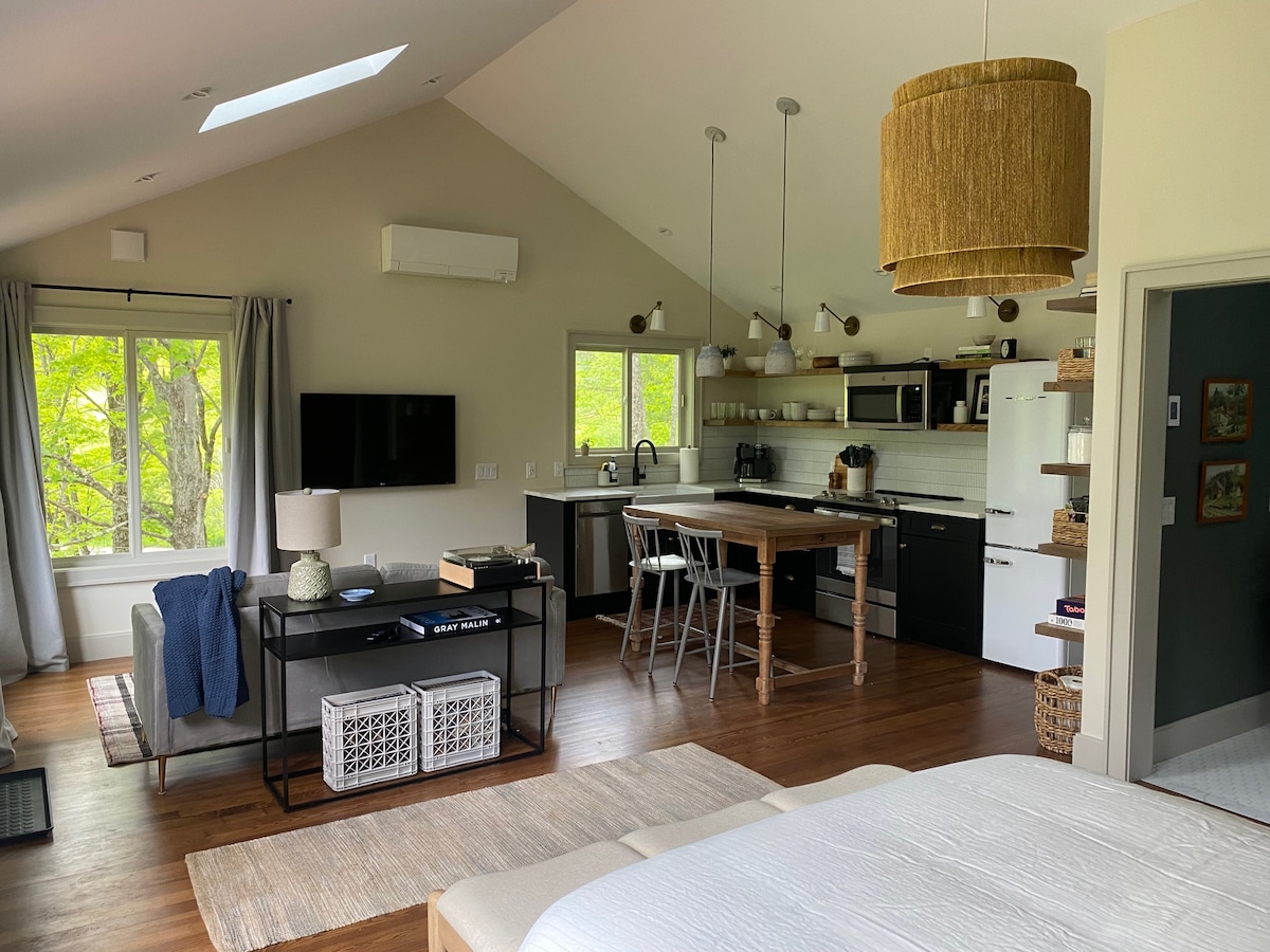 Welcome to our newly renovated studio apartment, nestled among the trees in the serene hills of West Windsor, Vermont. Elevated on the second floor, this separate structure offers a tranquil escape with breathtaking views of Mount Ascutney and our own private pond. Immerse yourself in the comforts of this thoughtfully designed studio apartment, surrounded by the natural beauty of the Vermont landscape. Every detail has been curated to ensure your utmost comfort and enjoyment.