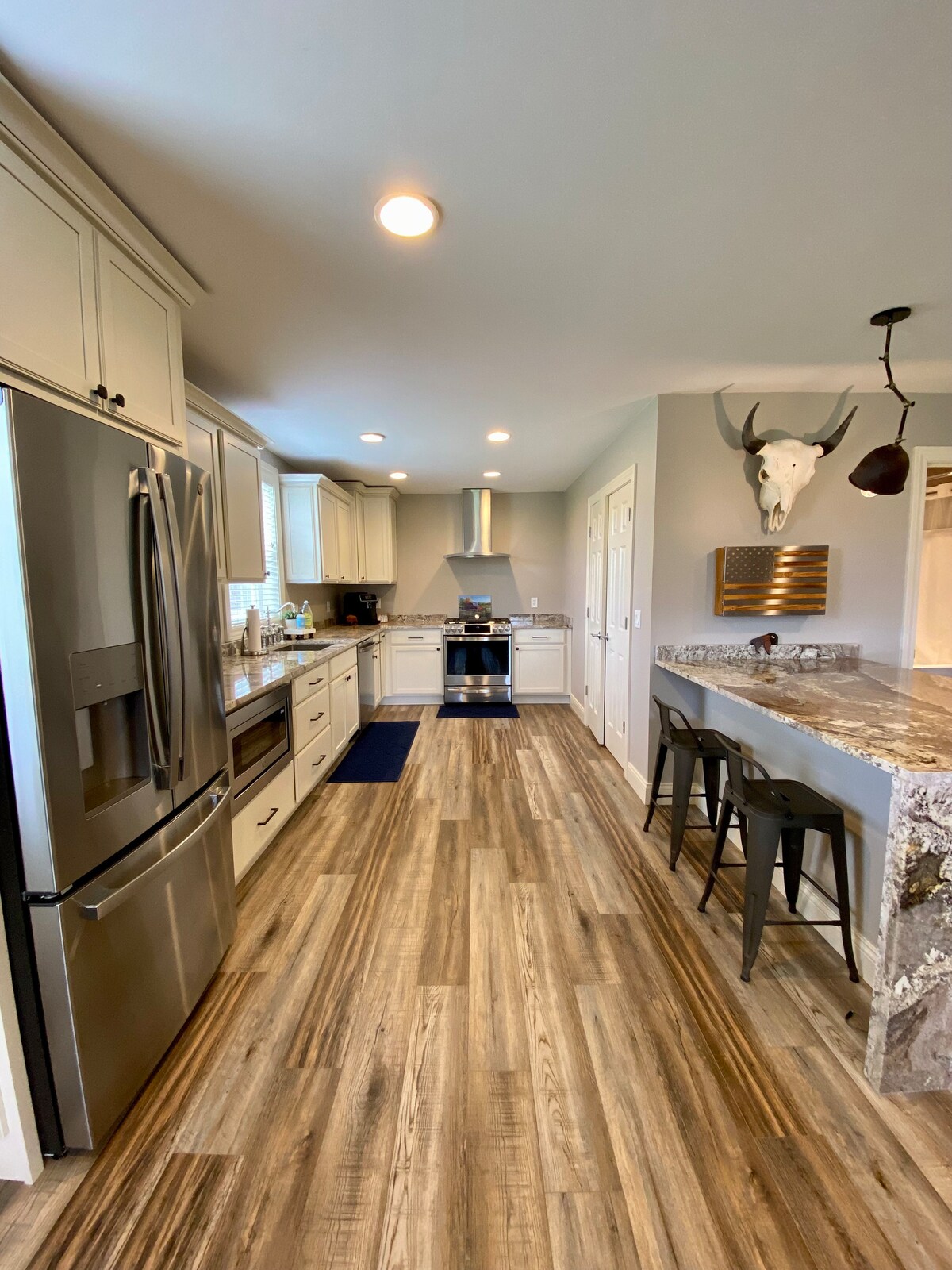 Dit comfortabele en gezellige huis ligt in het hart van het centrum van Lawrenceburg en ligt op loopafstand van alles! We hebben een grote achtertuin die geweldig is voor familie om bij de vuurplaats rond te hangen en te genieten van hun tijd weg van huis. Er is grote buitentelevisie met adirondack stoelen en picknicktafels om te ontspannen. Woonkamer heeft 75'tv- beide slaapkamers hebben 55' tv 's. Grote Sectional in Woonkamer en grote eettafel in keuken. Koffiebar- Wasmachine en droger - veranda aan de voorkant in de achtertuin.