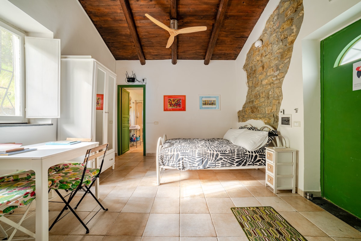 La Casa con ingresso indipendente è parte di uno Stabile "Rurale" di inizio '900. Bagno privato, letto matrimoniale, divano letto, frigo da camera, TV, WI-FI ed una romantica veranda con "vista da cartolina" dove poter sorseggiare un drink, un infuso, fare colazione o addirittura prendere ispirazione ed usarla come "workstation". L'accesso è agevole dalla strada o dal parcheggio, (eventualmente disponibile), attraverso il giardino di limoni, la corte privata e pochi scalini.
