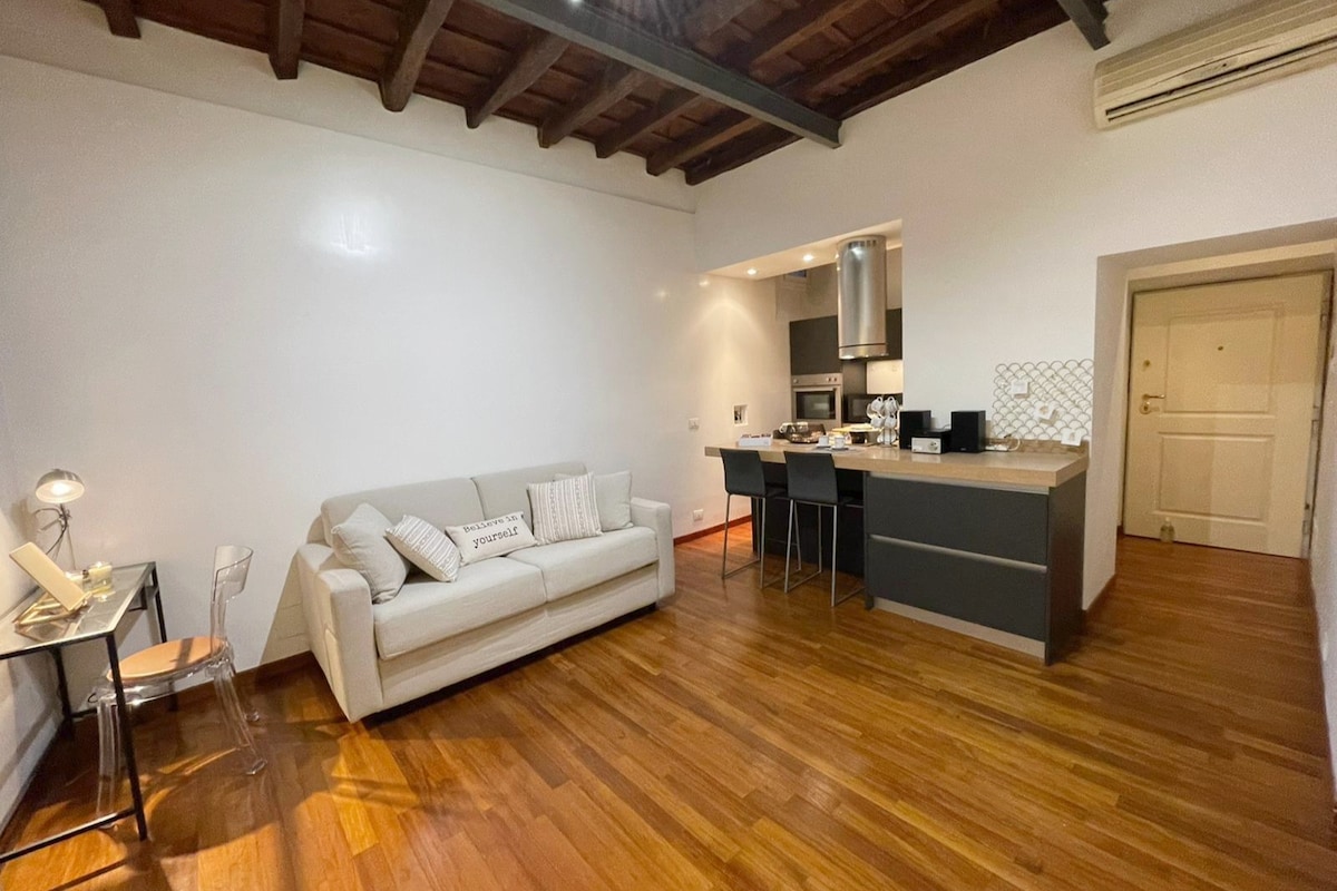 Uitzonderlijke locatie op een paar meter van het Piazza Navona en van alle belangrijke bezienswaardigheden, in de historische Via del Governo Vecchio, een straat beroemd om restaurants, bistro 's, winkels en oude paleizen. Op de vierde verdieping, met lift, is het appartement rustig en bestaat uit een slaapkamer, een woonkamer met een tweepersoonsslaapbank en open keuken, een inloopkast/kast en een grote badkamer. Uitgerust met WiFi, airconditioning en smart-tv.