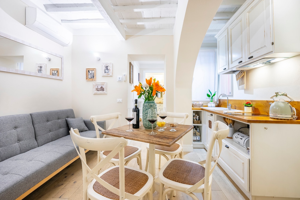 “Raffaello” – Ervaar Florence vanuit deze elegante studio van 30 m², gelegen op de eerste verdieping van een historisch gebouw aan de Via dei Calzaiuoli, op slechts een steenworp afstand van de Duomo. Het zeldzame privéterras van 35 m², ingericht met een tafel, stoelen en een parasol, biedt een unieke ruimte om te ontspannen en in elk seizoen van de stad te genieten. Het appartement beschikt over airconditioning, centrale verwarming en een lift, wat het hele jaar door comfort en gemak in het hart van Florence garandeert.