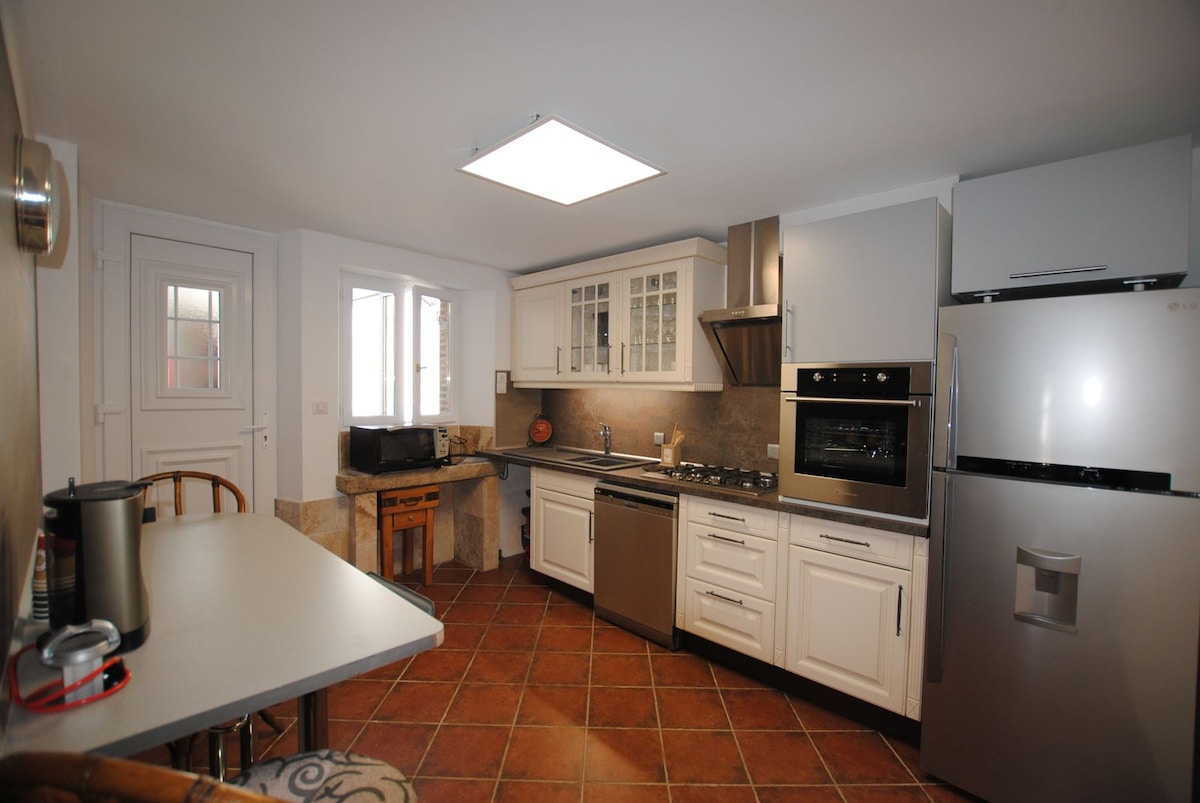 De ruimte Het appartement is 2 verdiepingen met 2 slaapkamers op een rij. Ideaal voor een stel met kinderen. Toegang is via een externe trap die leidt naar een terras met uitzicht op de privétuin met uitzicht op de St Denis-kerk. Het appartement heeft op de eerste verdieping een ruime woonkamer met een eethoek naast de Amerikaanse keuken, een woonkamer met een houtkachel, een doucheruimte en een apart toilet. Een interne trap bedient boven twee slaapkamers op rij.
