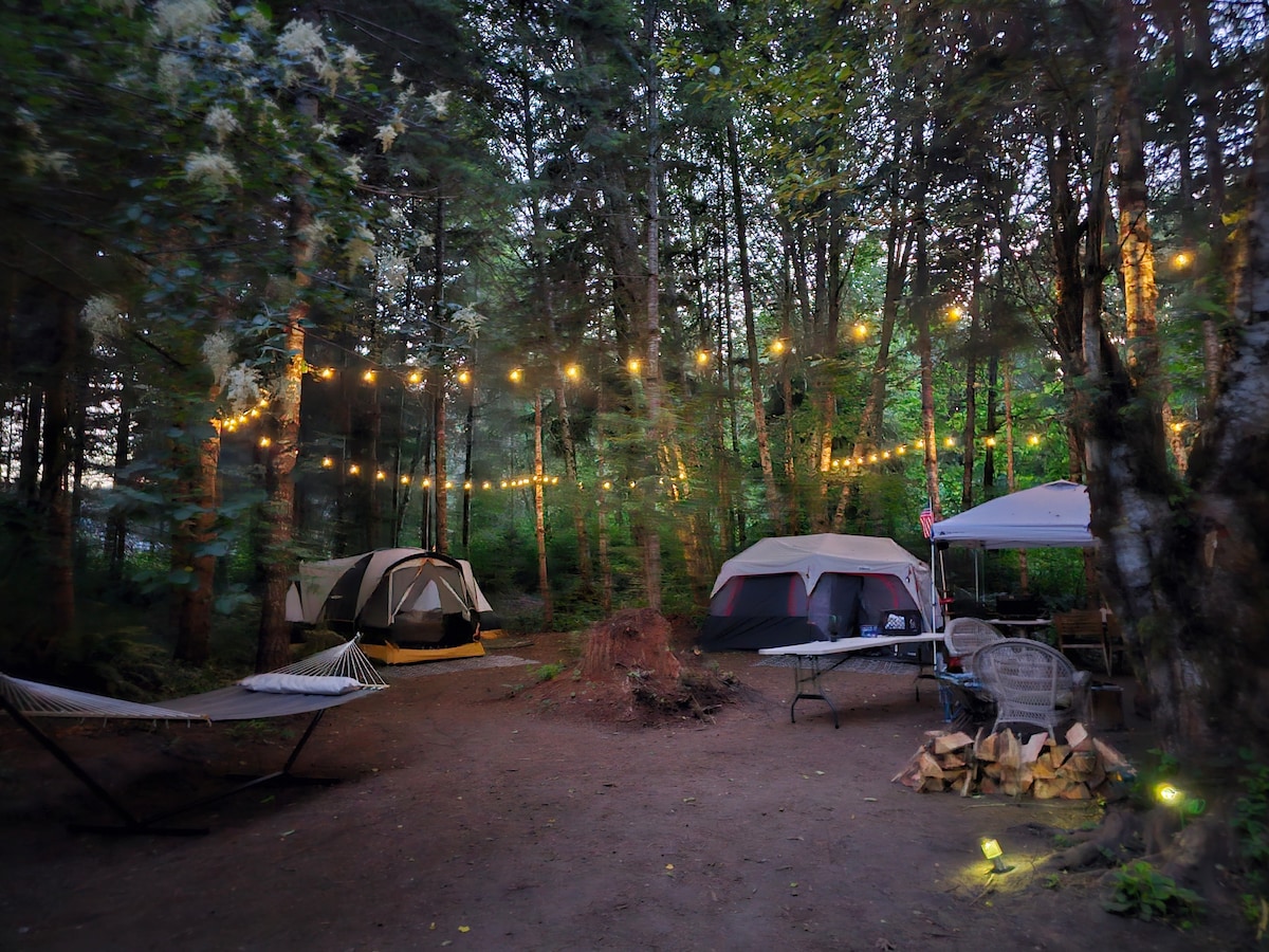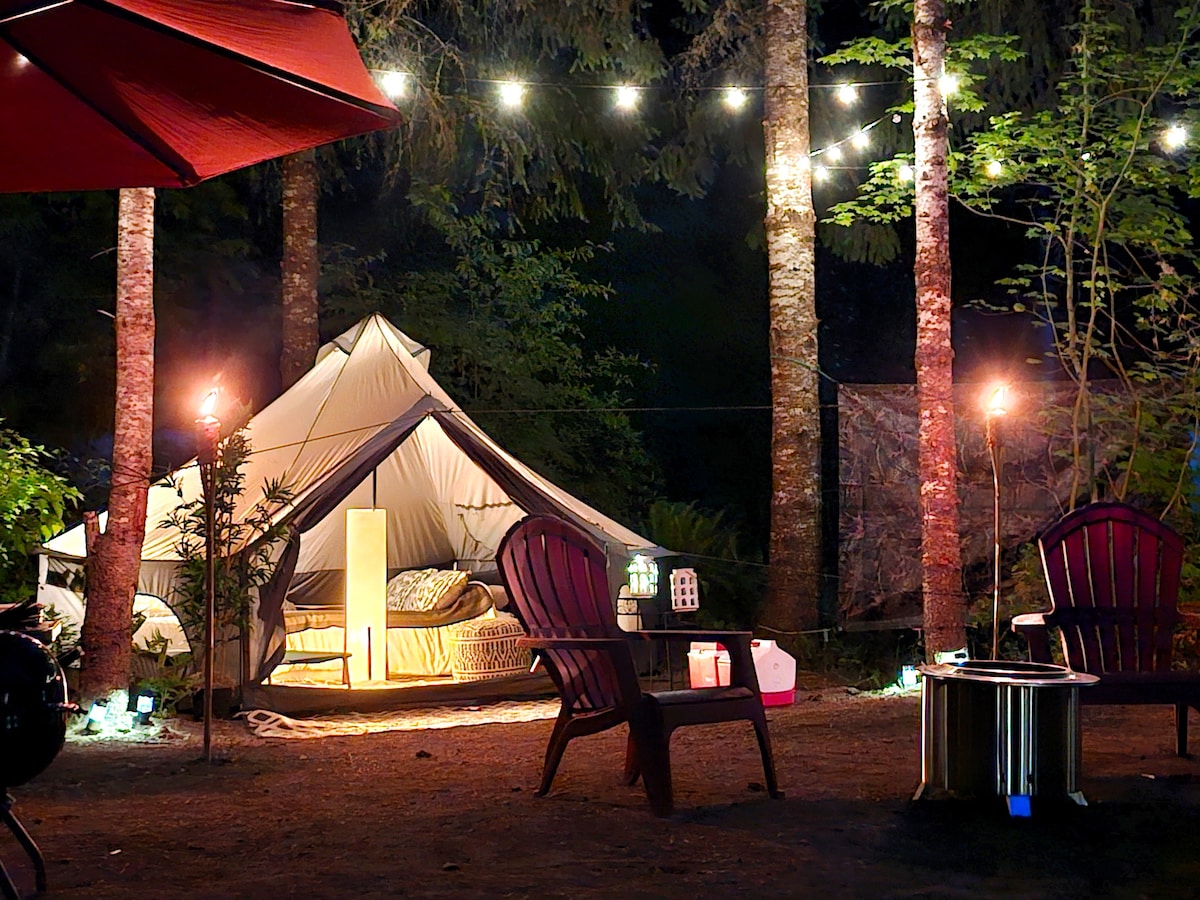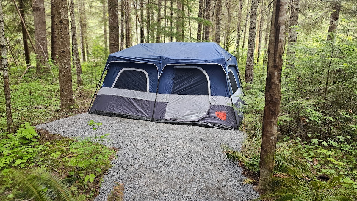 Kampeer in luxe zonder al het werk! Een korte rit van 10 minuten naar de ingang van Mt Rainier Park. We zijn in de buurt van de rivier de Nisqually en op enkele minuten van het prachtige stadje Ashford. Je kunt genieten van een unieke ervaring in onze glamping tent! Afgelegen, privéruimte op 26 hectare met volwassen bomen en wilde dieren. Luxe kingsize bed, minikoelkast, Keurig en een gezellige tafel voor 2 met spelletjes om te spelen. Verwarmd door een propaan open haard. Er staat een warme douche voor je klaar nadat je klaar bent met je avonturen!