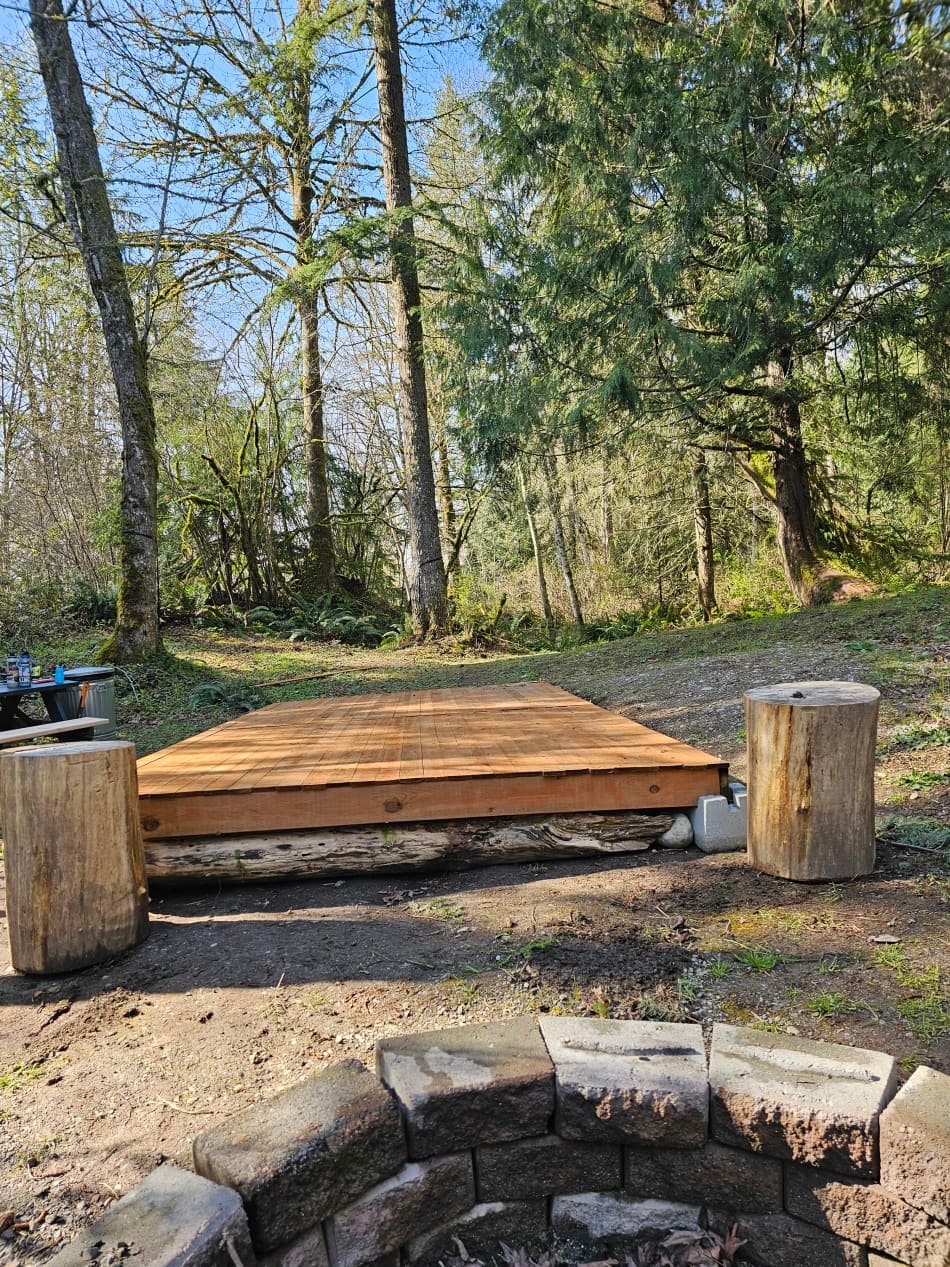 Deze unieke feeënwoning is een tent/hut van 10x20, genesteld in de bomen. Slechts 37 mijl naar Mt Rainier National Park. Een enigszins verwarmde slaapplek met een queensize bed (met bedwarmer voor koude nachten). Overdekte buitenkeuken met kampfornuis, barbecue, kookgerei en servies. Eigen bijgebouw met composttoilet. Geniet van de gedeelde buitendouche (douche in hoofdhuis bij koud weer) en gedeelde vuurplaats. Of zwaai in een hangmat in onze magische WoodHenge. EV-oplader beschikbaar
