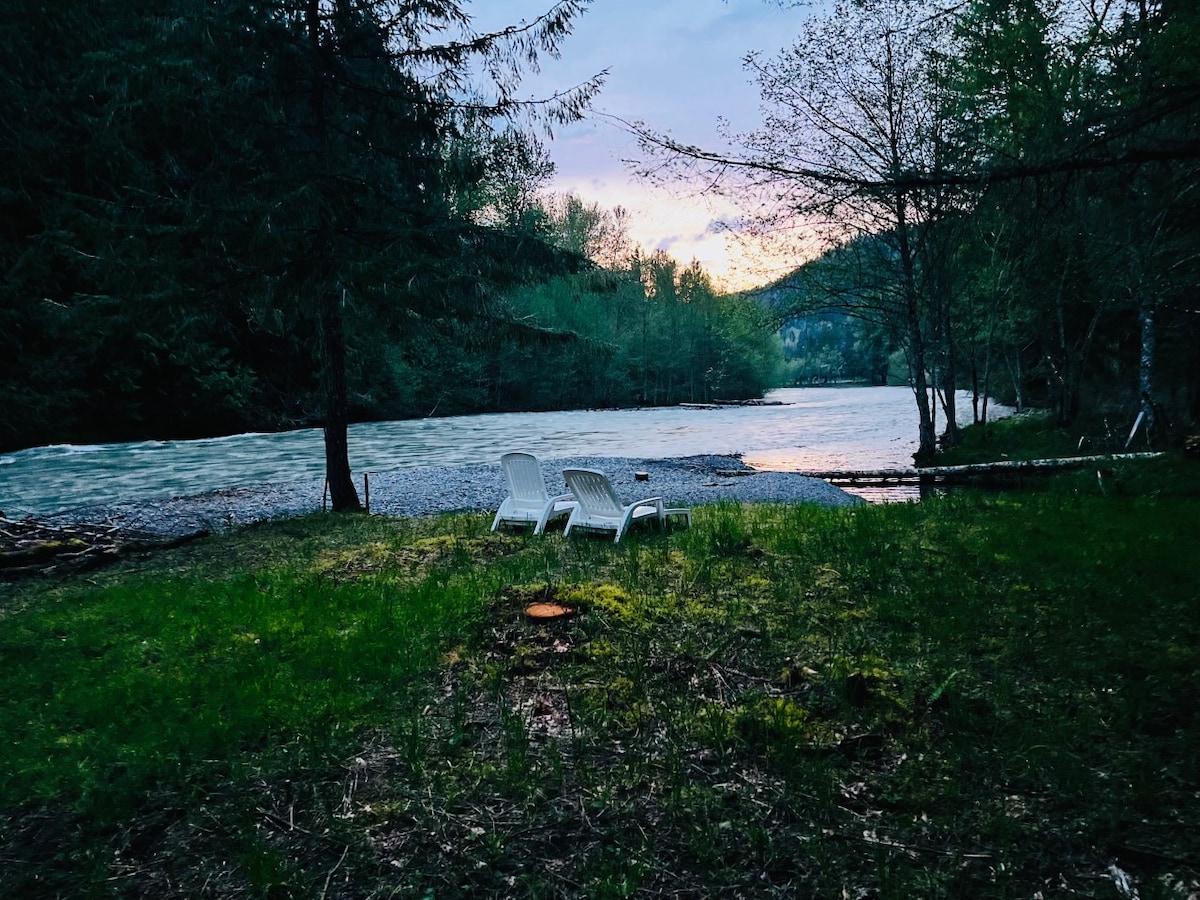 Ontdek onze afgelegen boerderij aan de rivier van 30 hectare in Enumclaw, WA! Exclusief voor campers of reizigers met auto's, vrachtwagens of busjes die geschikt zijn voor kamperen - absoluut geen campers, bussen of campers. - Bezoek onze boerderij - 3 stranden en 30 hectare rivier - Vuurplaats met stoelen -hottub en douche - Buitenkeuken - Hondvriendelijke paden en meer - Inclusief 2 gasten - LGBTQ-hosts - Informeer naar andere schuilplaatsen op het land. Ik daag je uit om op avontuur te gaan naar onze boshals!