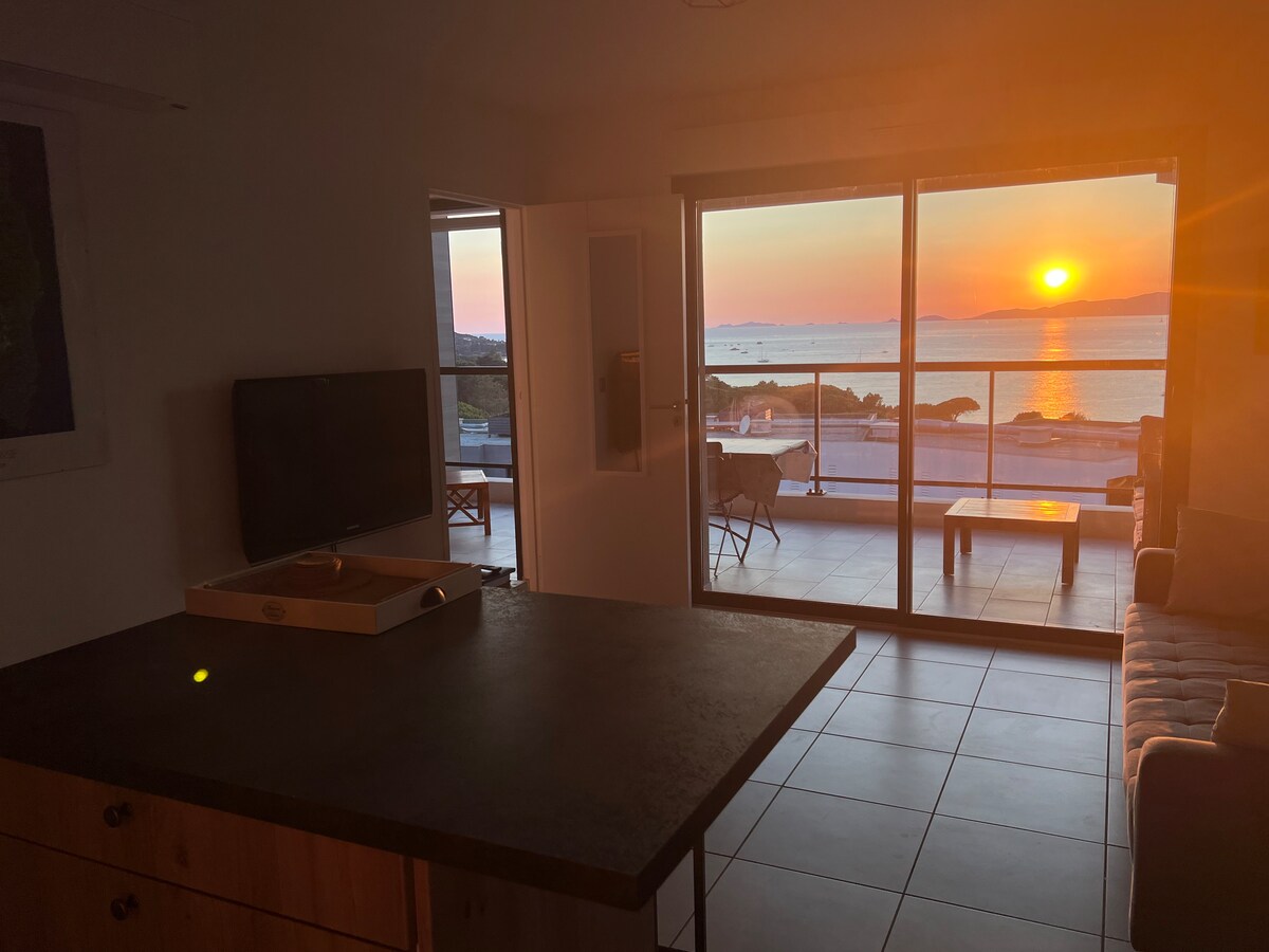 T3 met prachtig zeezicht, nieuw, comfortabel, nette, moderne inrichting, 50 m van een baai en 100 m van het strand van Agosta. Groot privéterras van 20 m², panoramisch uitzicht (180°): schiereiland Isolella, Sanguinaires-eilanden, Ajaccio, strand van Agosta; uitgerust voor maaltijden en ontspanning. Binnen: 60 m² volledig voorzien van airconditioning, grote woon-eetkamer, 2 slaapkamers met bedden van 160 cm (waarvan één met uitzicht op zee) en grote kasten, aparte volledig uitgeruste keuken, wasmachine, droger.