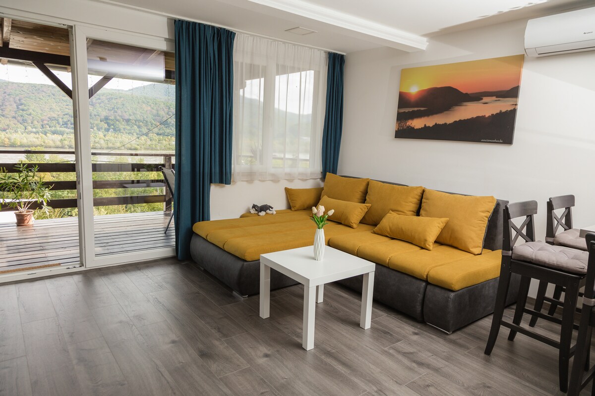 Prachtig panoramisch uitzicht, frisse lucht en rust. In deze omgeving is het huis gebouwd, waarvan de bovenste verdieping het bruine appartement is. Het heeft een privéterras van 30 m ² waar je het kasteel van de Donau en Visegrad kunt bewonderen. Je zult het heerlijk vinden om 's avonds een glas wijn te drinken met een glas wijn in je handen voor boten en de lichten van Visegrad. Het appartement heeft twee verdiepingen, onderaan is het enorme terras, de woonkamer, keuken en badkamer, er zijn twee slaapkamers op de bovenste verdieping.