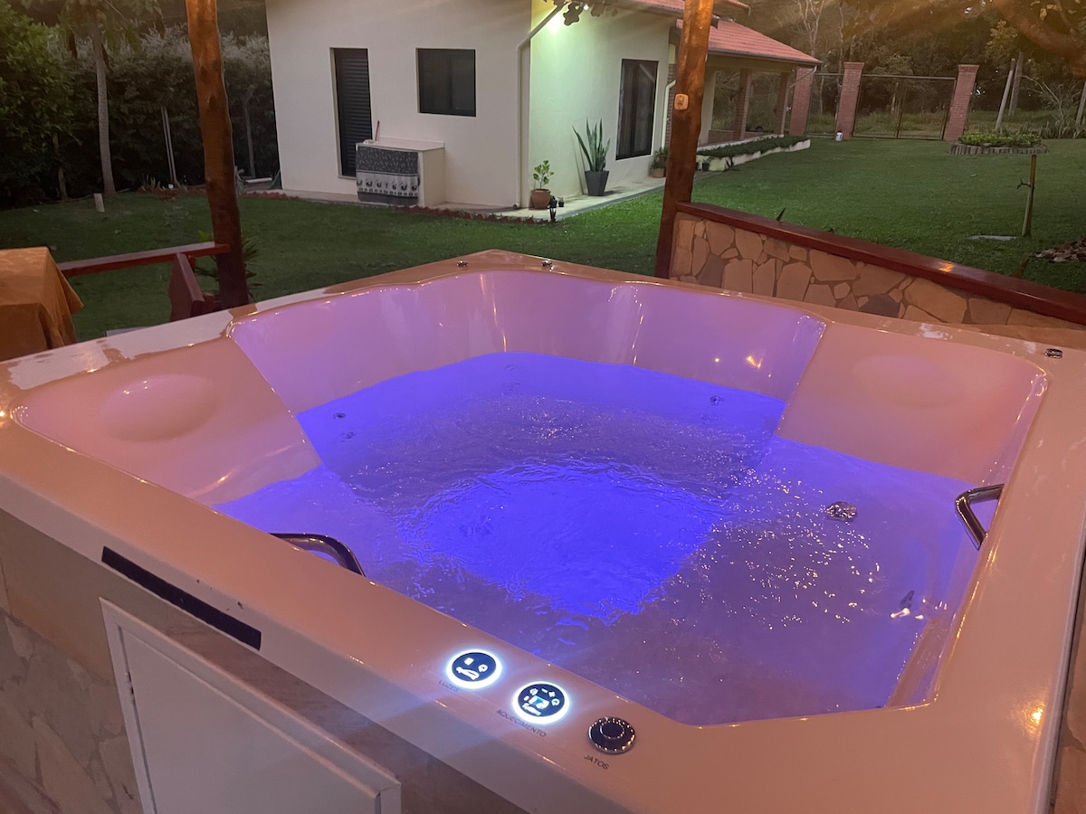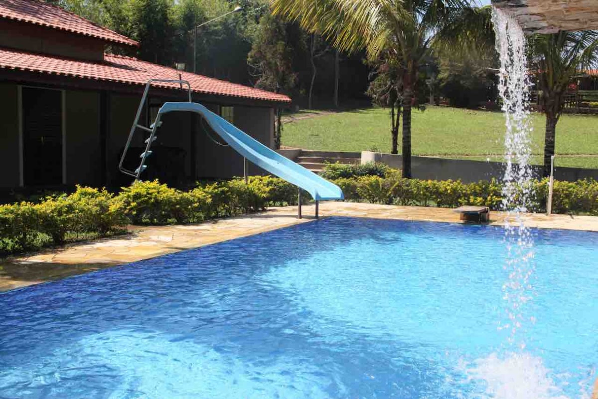 Relaxe com a família no nosso pedacinho do céu! 🌅 Recém reformada, com piscina, redes, balanços, vista da serra, pomar, estacionamento, área gourmet, churrasqueira, lareiras, aquecedor externo, casa telada, segurança 24h, TVs smart, wi-fi e jogos para a família. Apenas 500m do Thermas Water Park, 100m do Haras Bela Vista e 5min de Águas de São Pedro. Oferecemos travesseiros, lençol de elástico e cobertas leves. Todos os utensílios de cozinha e de churrasco.