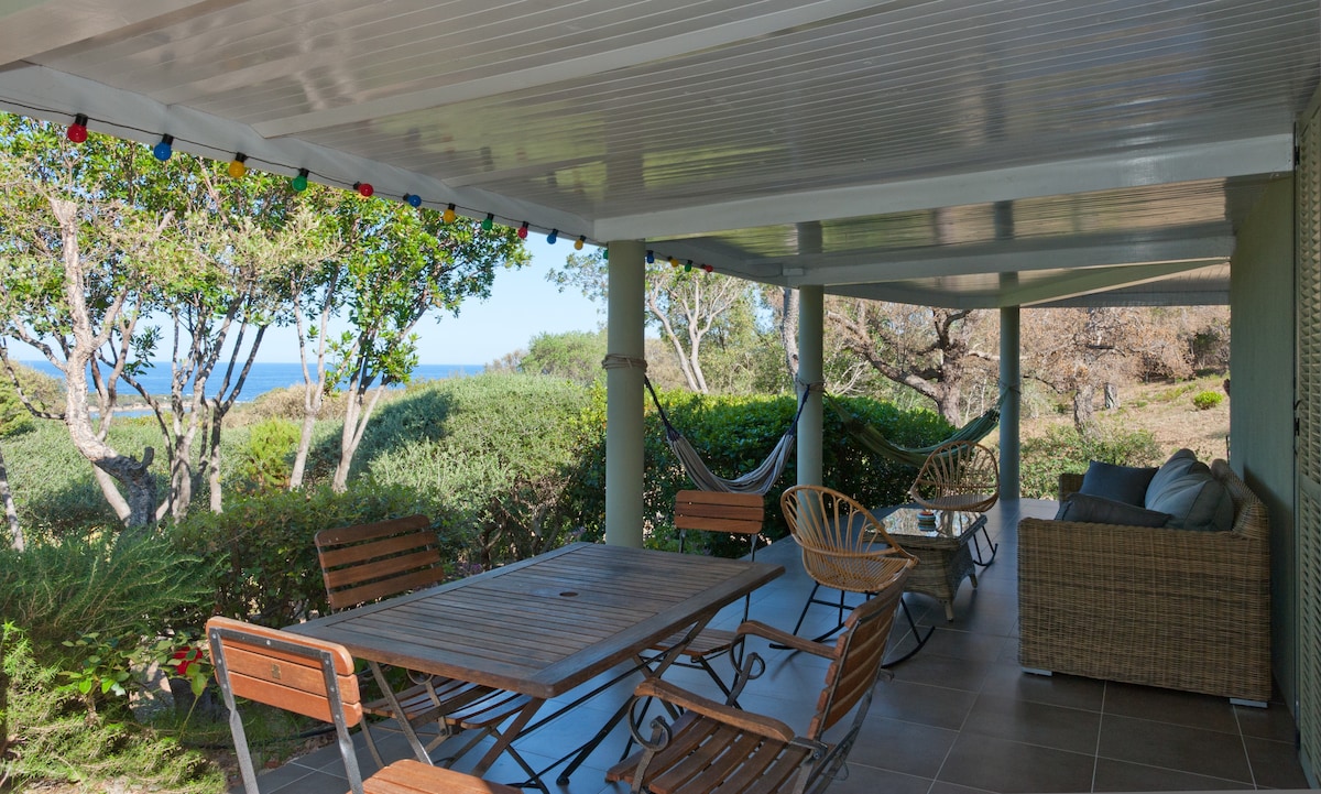 De villa is gelegen op een heuvel met uitzicht op Palombaggia Beach. Het 100 vierkante meter grote terras en zwembad bieden een aangenaam zomerleven en een prachtig uitzicht op zee. Beide slaapkamers, de woonkamer en de keuken hebben ook uitzicht op de zee. Het is gelegen op een rustige plek omgeven door struikgewas. Het heeft ook een eigen campertoegang (gedeeld met andere bewoners) tot Palombaggia Beach, op 1200 meter afstand.