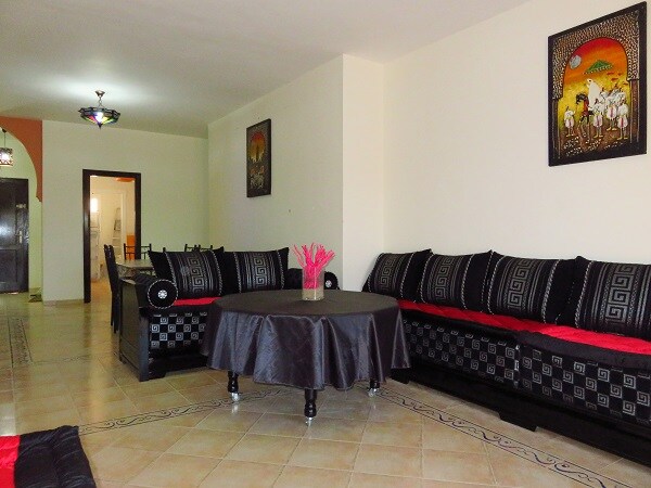 Mooi luxe appartement, ideaal voor stellen of kleine gezinnen, gelegen op slechts vijf minuten van het strand en dicht bij Marjane en alle voorzieningen. Dit luxe appartement is gelegen in een 24/7 beveiligde residentie met twee toegankelijke zwembaden, één voor volwassenen en één voor kinderen, evenals een groene ruimte en gratis parkeergelegenheid. Ruime kamer, zeer comfortabele bank, zeer goed uitgeruste keuken, prachtig terras. Airconditioning op alle kamers.