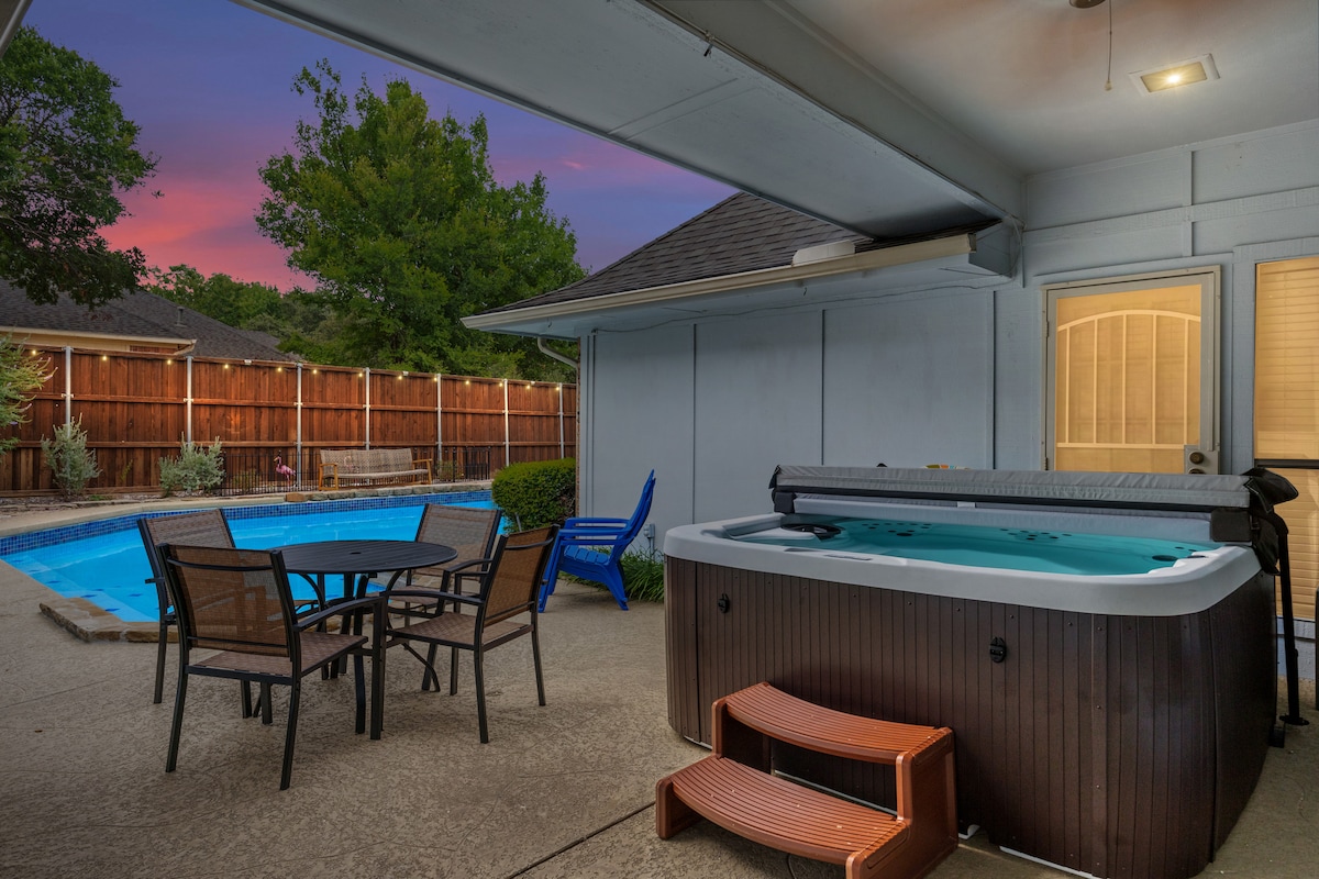 Charmante en ideaal gelegen woning in hartje Plano. Superproper binnen en buiten, met een ontspannend verwarmd zwembad, bubbelbad, extra grote woonkamer, PS5, speelkamer, jacuzzi, terras en vuurplaats, zodat je kunt genieten van het heerlijke Texaanse leven! Terrasmeubilair, loungestoelen en een barbecue zijn beschikbaar in de achtertuin. We hebben veel zwembadspeelgoed, bordspellen, pingpongtafel en kinderspeelgoed voor het hele gezin om van te genieten. Wij bieden eenvoudig in- en uitchecken.