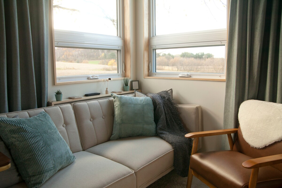 We hebben deze ruimte ontworpen voor een warm, gezellig uitje. Het algemene doel van het ontwerp was een verbinding met de natuur en met degene waar je van houdt, die de schoonheid van de Driftless-regio benadrukt. Gebruik de eigen sauna of buitenbad voor een unieke ervaring. Kom in contact met de natuur in het Driftless Area van SW Wisconsin, rijd vanaf deze centrale locatie naar een van de bezienswaardigheden, waaronder het House on the Rock, Taliesin, Devil's Lake Park en meer. Neem ook je hond metgezel mee, er is een areaal om rond te zwerven.