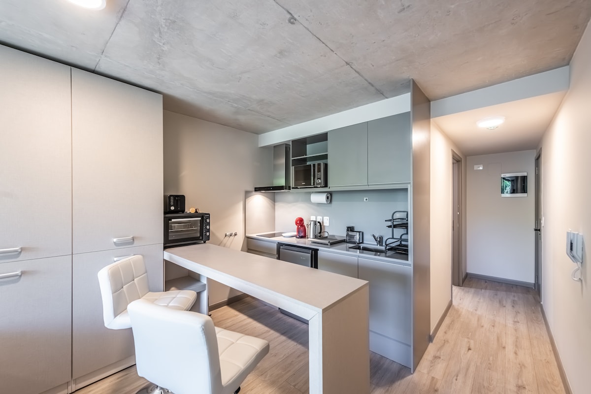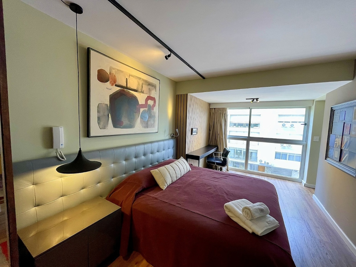 Moderno estudio en Puerto Buceo, ideal para 1 o 2 personas. Estilo minimalista con mucha luz natural, cama matrimonial, comodo sofá, escritorio y cocina equipada. Cuenta con Wi-Fi de alta velocidad, aire acondicionado, smart TV, horno electrico y lavadora. Disfrutá de una amplia terraza con vista despejada. A pasos del WTC, Montevideo Shopping y la rambla, con excelente conexión a toda la ciudad. Perfecto para viajes de negocios, escapadas en pareja o estadias de larga duración.