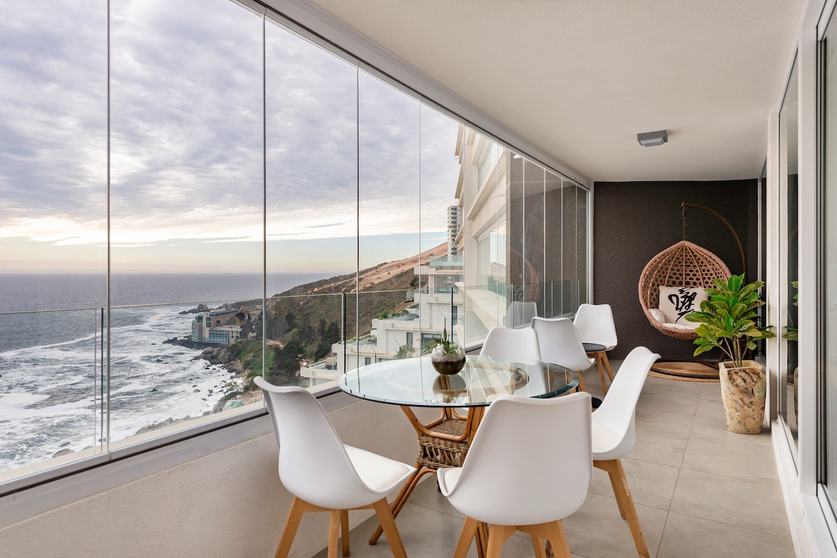 Appartement gelegen voor het strand van Cochoa in Reñaca, onoverwinnelijk uitzicht (eerste lijn met uitzicht op zee), terras, eigen overdekte parkeerplaats, zwembad voor volwassenen, kinderbad, verwarmd zwembad, fitnessruimte. 3 slaapkamers (hoofdslaapkamer en suite met kingsize bed), 2 badkamers, 55 inch 4K Smart TV, HD kabel-tv, 600 Mbps glasvezel-wifi, volledig uitgeruste keuken, glazen keramisch aanrecht, wasmachine, alle apparatuur is elektrisch. Liften. Kabelbanen om naar het strand te gaan.