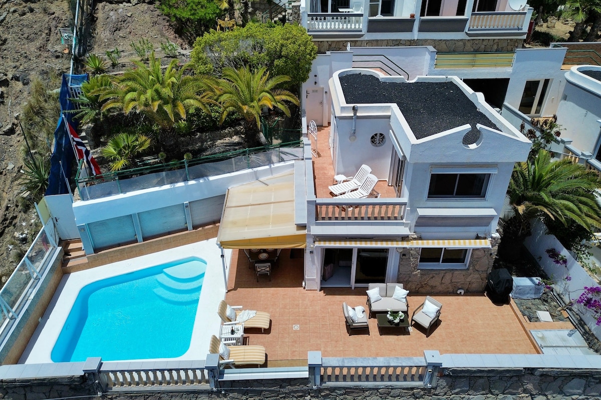 Lovely and high quality villa in the sunny area close to the famous Amadores beach or Anfi Golf! The Villa is designed to high standards, with a fully equipped kitchen, 2 lounges, 4 bedrooms, 4 bathrooms, generous courtyard terrace, bbq area, botanical garden / heated swimming pool. Is a private place, where comfort is valued. Family-oriented, kids will love the pool area. Youll be 5 minutes away from the best beaches, the newest mall in GC.