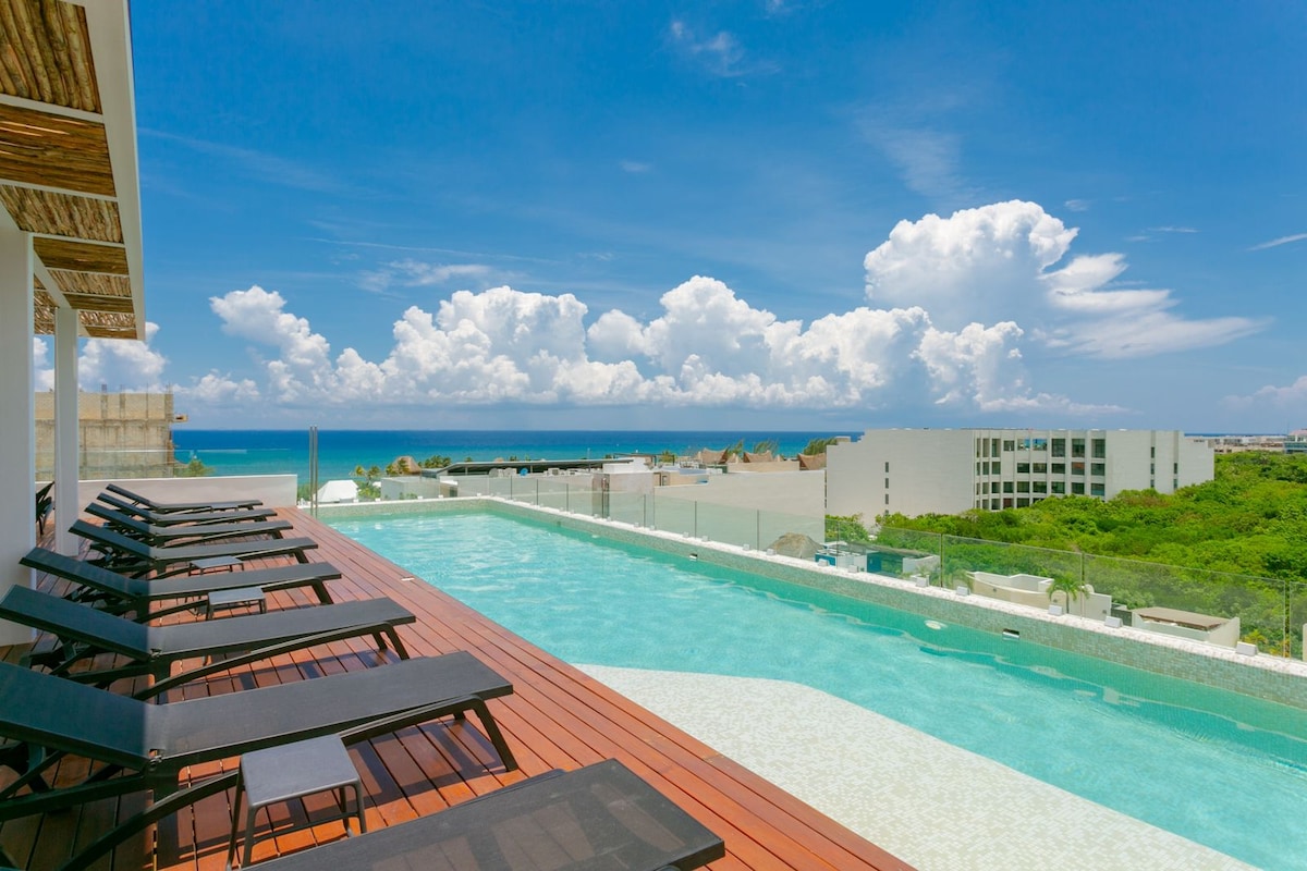 ¡Disfruta del lujo y la comodidad en nuestro departamento! Cuenta con 1 recámara elegante con vista al mar, de una terraza privada y amplia con vista espectacular. A pocos minutos caminando de la playa y la quinta avenida. Estacionamiento privado, seguro y gratuito. Rooftop con vista al mar Caribe, alberca, jacuzzi, Gym y baño de vapor. Cuenta también con lobby y su recepción y seguridad 24/7. ¡Reserva ahora y vive una experiencia inolvidable!