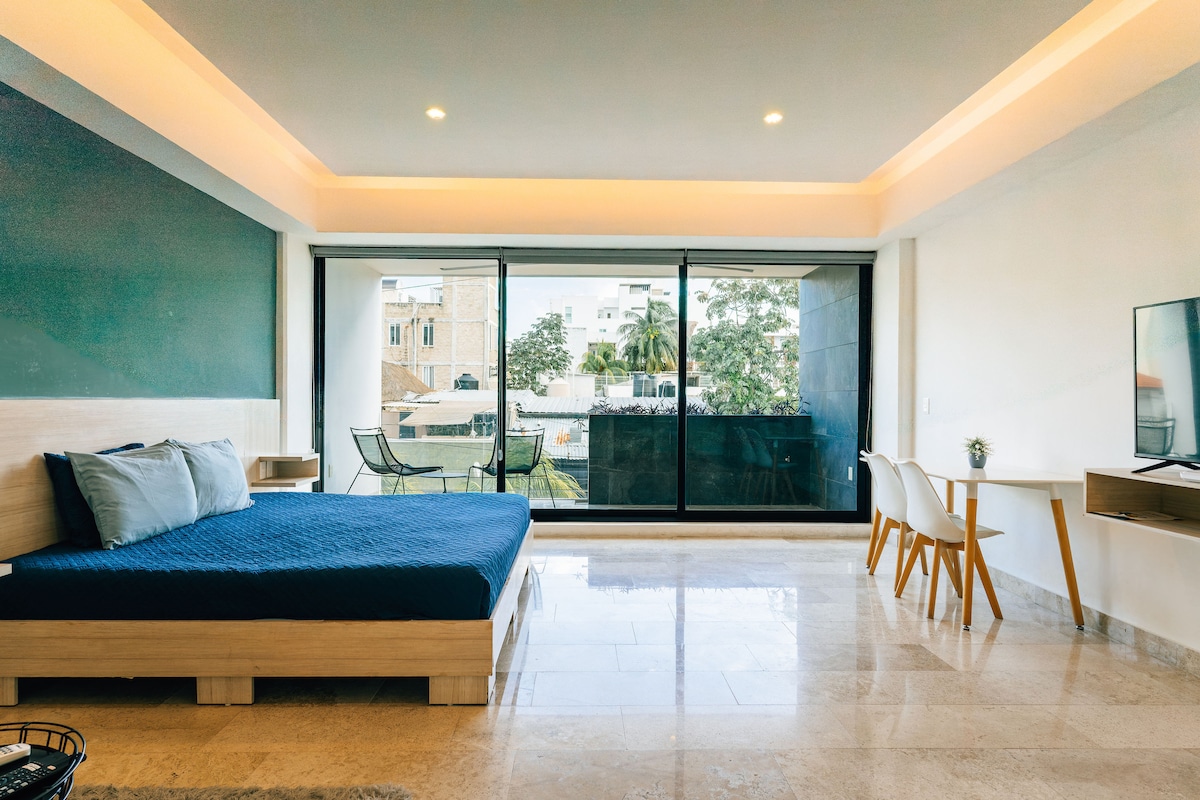 Dit unieke + moderne appartement met 1 slaapkamer ligt in de mooiste met bomen omzoomde straat in Playa del Carmen, met ongelooflijke cafés, bars, restaurants, lokale winkels en het strand. Het ligt dicht bij alles, waardoor het gemakkelijk is om je bezoek te plannen. Loop een dagje naar het strand, wandel 's avonds langs 5th Avenue of geniet gewoon van je nautisch geïnspireerde appartement + privéterras, of ga naar je prachtige dak en geniet van het spectaculaire uitzicht op zee terwijl je geniet van de bar + het zwembad.