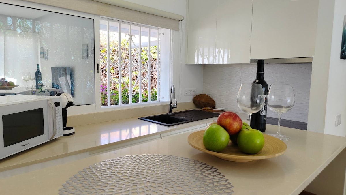De Sol de Maspalomas bungalow is een prachtige, moderne en elegante plek die je vakantie onvergetelijk zal maken. Gelegen in een complex van slechts acht appartementen in de beste buurt van het Maspalomas International Field, op slechts 30 minuten lopen van de duinen en de vuurtoren van Maspalomas, zeer dicht bij de beste restaurants van de commerciële laan van Meloneras en C. C. Yumbo, op twee minuten van de golfbaan en de tennisclub en op een minuut van de supermarkt.