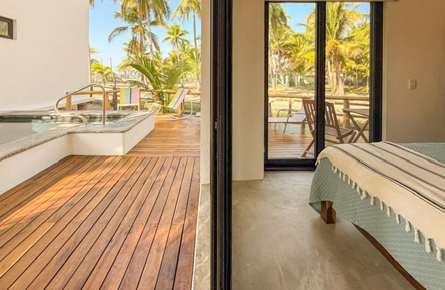 Geniet van onze Coral beach bungalow, direct aan het zand. Het is ontworpen met natuurlijke materialen en biedt 1 kingsize slaapkamer, 1 kingsize slaapbank en 2 badkamers. De keuken en woonkamer komen uit op een terras en houten terras met een eigen verwarmd zwembad met uitzicht op zee. De villa is in december 2024 opgeleverd en is geheel nieuw. Gasten kunnen ook gebruikmaken van een gedeeld overloopzwembad met hangmatten en strandparasols tussen de palmbomen. Een gemakkelijke, rustige plek om te genieten van de Mexicaanse kust.
