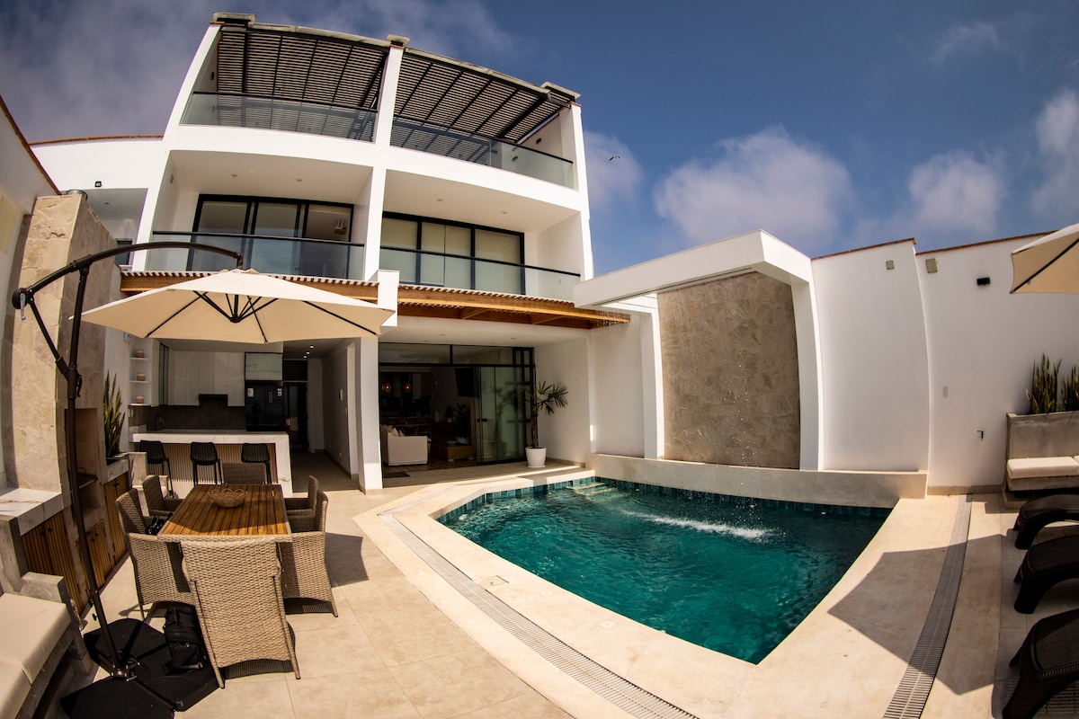 VIJF STERREN ACCOMMODATIE. GEZINSVRIENDELIJK. Hoge kwaliteit. Super schoon huis. 3 verdiepingen. 500 m2. Super comfortabel. Fantastische architectuur. Geweldig uitzicht overal. Een huis van de stad voor de oceaan + surfgolven entertainment om te kijken. Rustige buurt. Beter weer dan Lima City. 100 meter ten zuiden van Peñascal. Santa Rosa strand, in Lima, het meest vergelijkbaar met de stranden in het noorden van Peru. Grof wit zand!