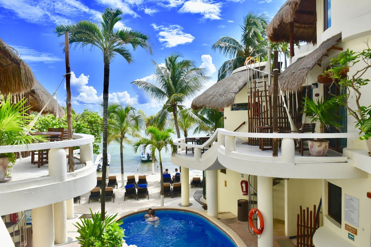 Mooie 1 slaapkamer, allemaal bont en uitgerust voor 6 (PAX) met 2 mooie gemeenschappelijke zwembaden, jacuzzi, airconditioning, fitnessruimte, 24/7 beveiliging, parkeren, op slechts een steenworp afstand van 5th AVE en 2 minuten lopen naar het beroemde Mamitas-strand... de rust van het Mexicaanse Caribisch gebied. Geweldige optie voor wie op zoek is naar een veilige plek in het centrum, het strand, supermarkten, cafés, winkels, ambachtelijke winkels en ook in een rustig appartement in het hart van Playa del Carmen. Gasten zullen 24/7 onmiddellijk aandacht hebben.