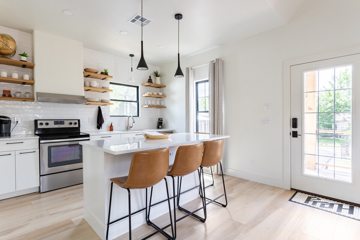 Ontworpen met natuurlijke texturen, aardse tinten en geweldig natuurlijk licht om een gezellige, rustige sfeer te garanderen die je niet wilt verlaten! Dbl mastersuite met 2 queensize bedden en 2 ensuite privébadkamers maakt dit perfect voor 2 koppels, gezinnen, professionals of iedereen die in het hart van OKC wil verblijven en toch een lokale ervaring wil krijgen. PLAZA is de beste kunstdistricten van OKC en op slechts drie blokken lopen van heerlijk eten, straatkunst van wereldklasse, koffie, lokale winkels, festivals, live muziek en meer. Downtown OKC ligt op 5 minuten rijden!