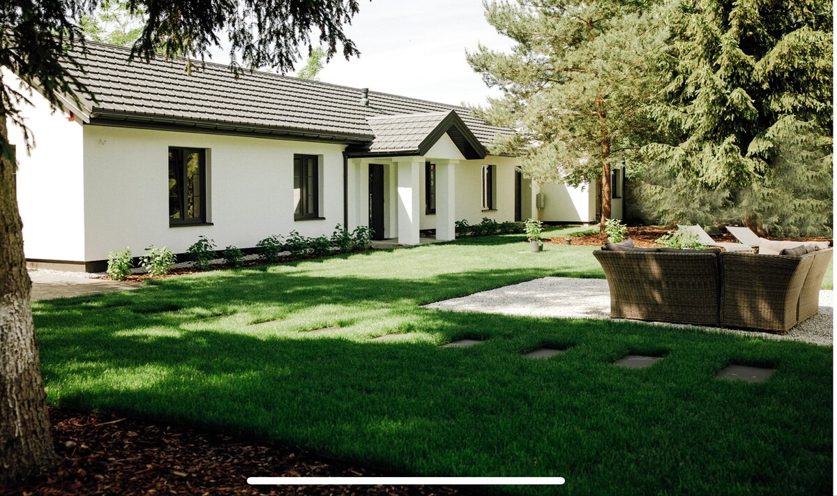 "Nad Wkra" - real treat for those who want to escape from city. One hour from Warsaw. River, greenness, space. Cozy and modern indoor. Spacious patio and large area with trampoline and little tree house surrounded by fence. River bank access with private deck and fire place. Beautiful and clean river. Ideal for kayaks, hiking and cycling. For nature lovers among many - black stork, white-tailed eagle and remainings of old oak forest. All seasons house.