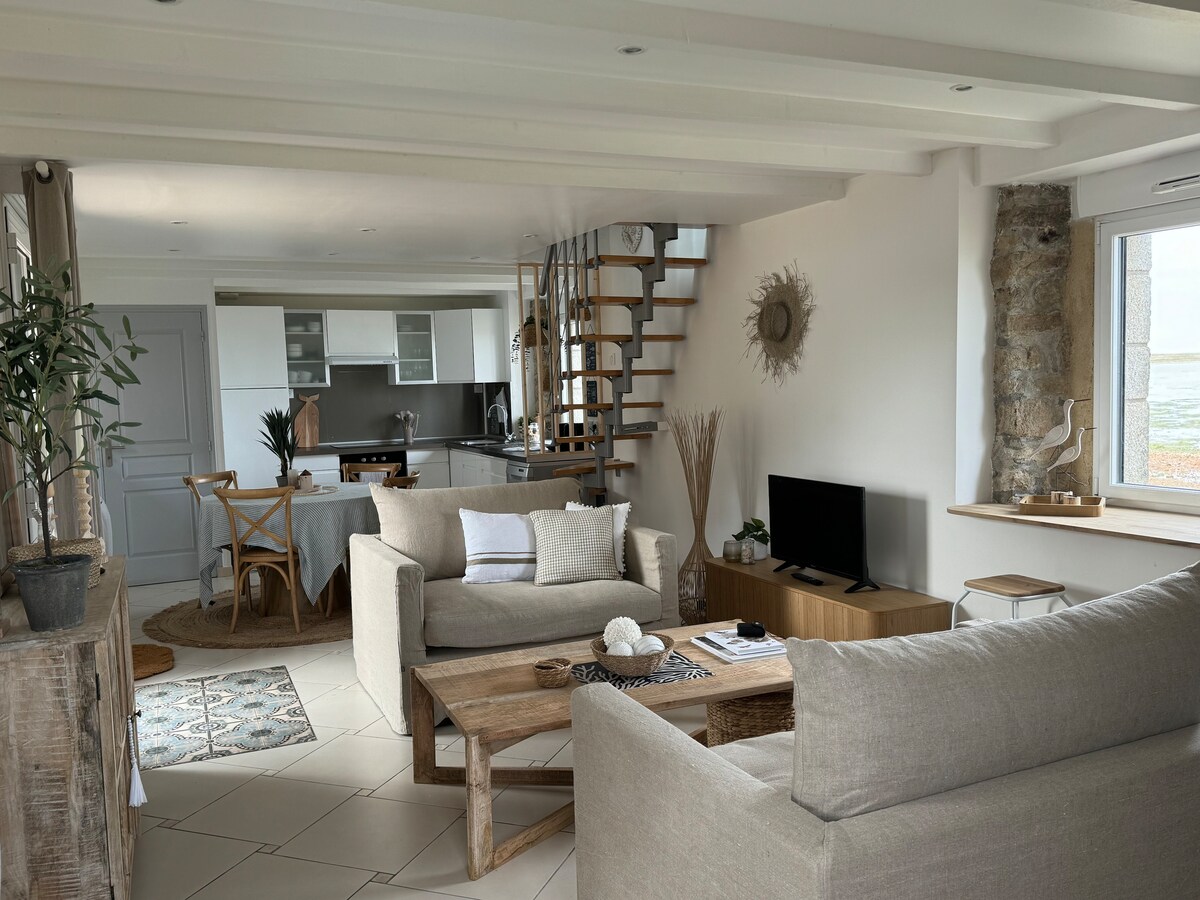 Welkom in onze Bretonse woning aan zee met directe toegang tot de Ria d’Etel! Deze ruimte heeft een prachtig uitzicht op de oceaan. Wij zijn verheugd om u de mogelijkheid te bieden om in ons huis te verblijven met zijn volledig gerenoveerde interieur en ideaal gelegen met uitzicht op zee. De tuin van 1.700 m², begrensd door de zee, biedt directe toegang tot een klein, afgelegen strand waar je bij vloed kunt zwemmen; anders is er zwemmen onder toezicht mogelijk op Kervegan Beach.