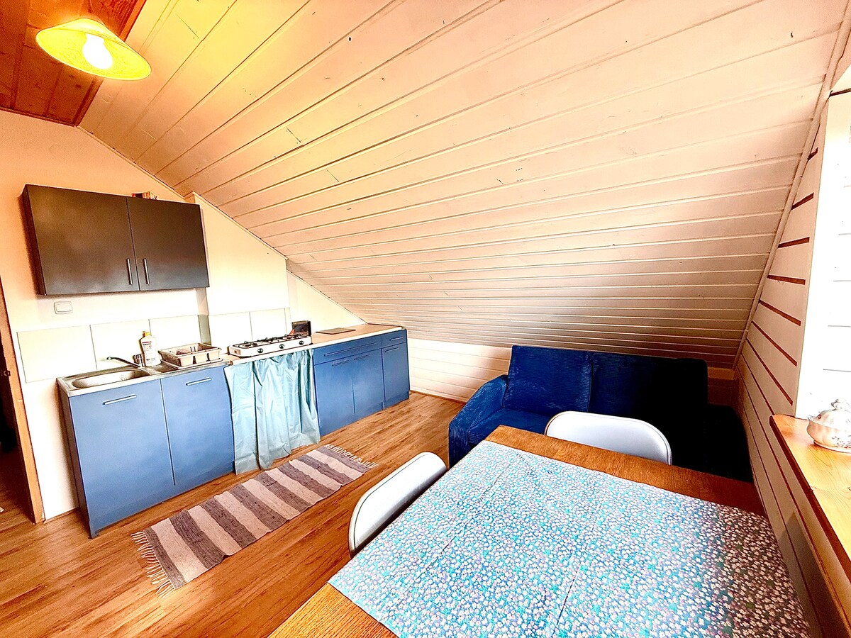 Het is het perfecte uitje midden in de natuur, weg van de drukte van de stad. De zolder is ruim en comfortabel, perfect voor een groep van maximaal 5 personen die willen genieten van de rust, stilte en schoonheid van de Mazurische landschappen. Er is een weelderige groene omgeving en een meer rond het huis. Het is de perfecte plek om te ontspannen wandelingen, vissen of gewoon buiten te ontspannen. Onze loft is een comfortabel asiel dat comfort combineert met de nabijheid van de natuur.