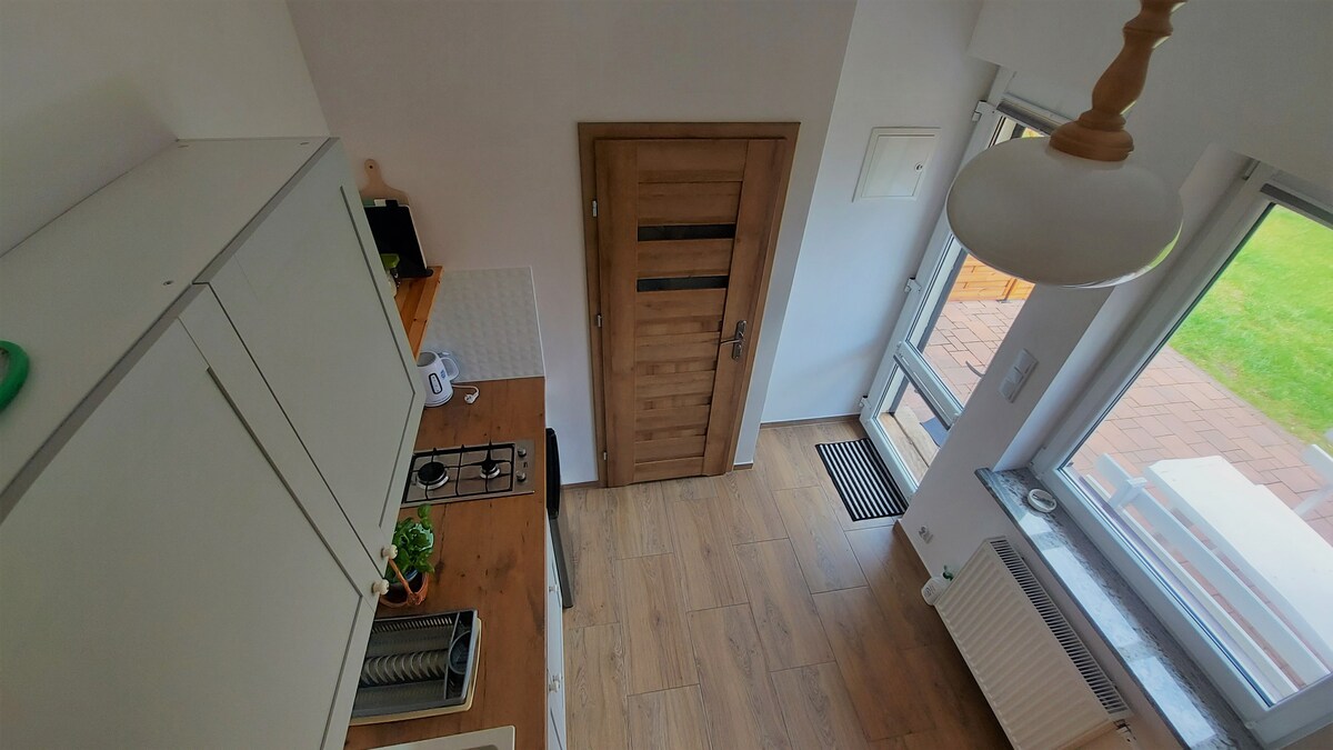 Een 2-kamer appartement (60 vierkante meter) met badkamer, met eigen kitchenette, koelkast. In de kamer is een openhaard, lcd-tv 42 inch , Poolse digitale terrestrische tv-kanalen, wifi, uitgang naar 2 balkons vanuit elke kamer en een directe uitgang naar de tuin.