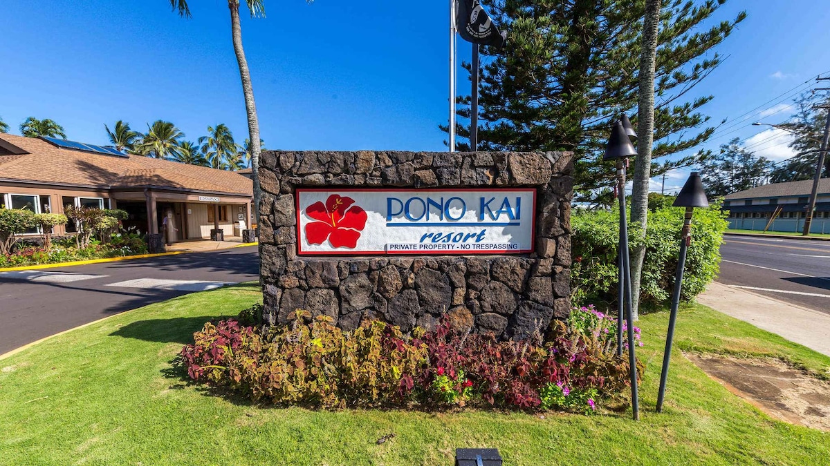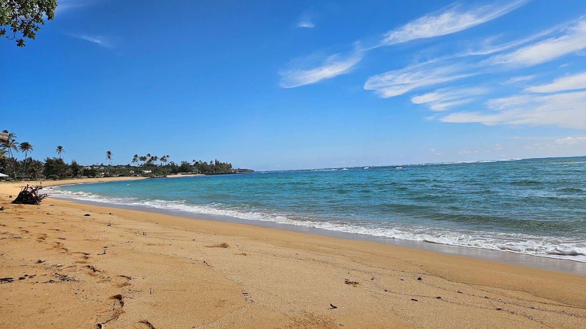 Aan het strand, 45 stappen van je lanai naar een onbezette strand & 8 mijl wandelen/fietsen strandpad. Vanaf de lanai eet en geniet van spectaculaire zonsopgangen, of loop een paar stappen om te snorkelen en te zwemmen. Belastingen en Airbnb-kosten zijn bij de prijs die je ziet inbegrepen. Kortingen: 7% week, 12% 28 dagen. 1e verdieping, geen gedoe met een lift. 4 slaapplaatsen, volledige keuken, airco. Gratis parkeren en wifi. Pono Kai heeft een zwembad, bubbelbad, fitnessruimte, spelletjes, tropisch terrein en meer. Makkelijk lopen naar "Old Town" Kapaa restaurants, winkels en nog veel meer.