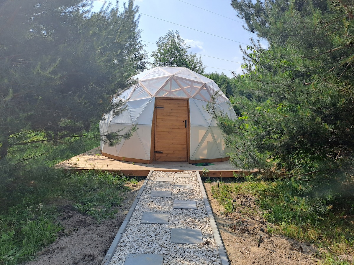 Een onvergetelijke en ongebruikelijke plek. Koepels zijn dicht bij de natuur, een origineel idee om een avond door te brengen met vrienden, een rustig vrijgezellenfeest of gewoon een pauze van de drukte van de stad. Er zijn 2 koepels op het perceel voor 6 personen en een houten huis voor 4 personen, dus als je van plan bent om ons te bezoeken in een groter pakket - nodigen we je uit, je hebt een exclusieve accommodatie. Op aanvraag tegen een extra vergoeding van 200 PLN We hebben een jacuzzi die buiten onder het prieel staat. Er is een tv aanwezig!