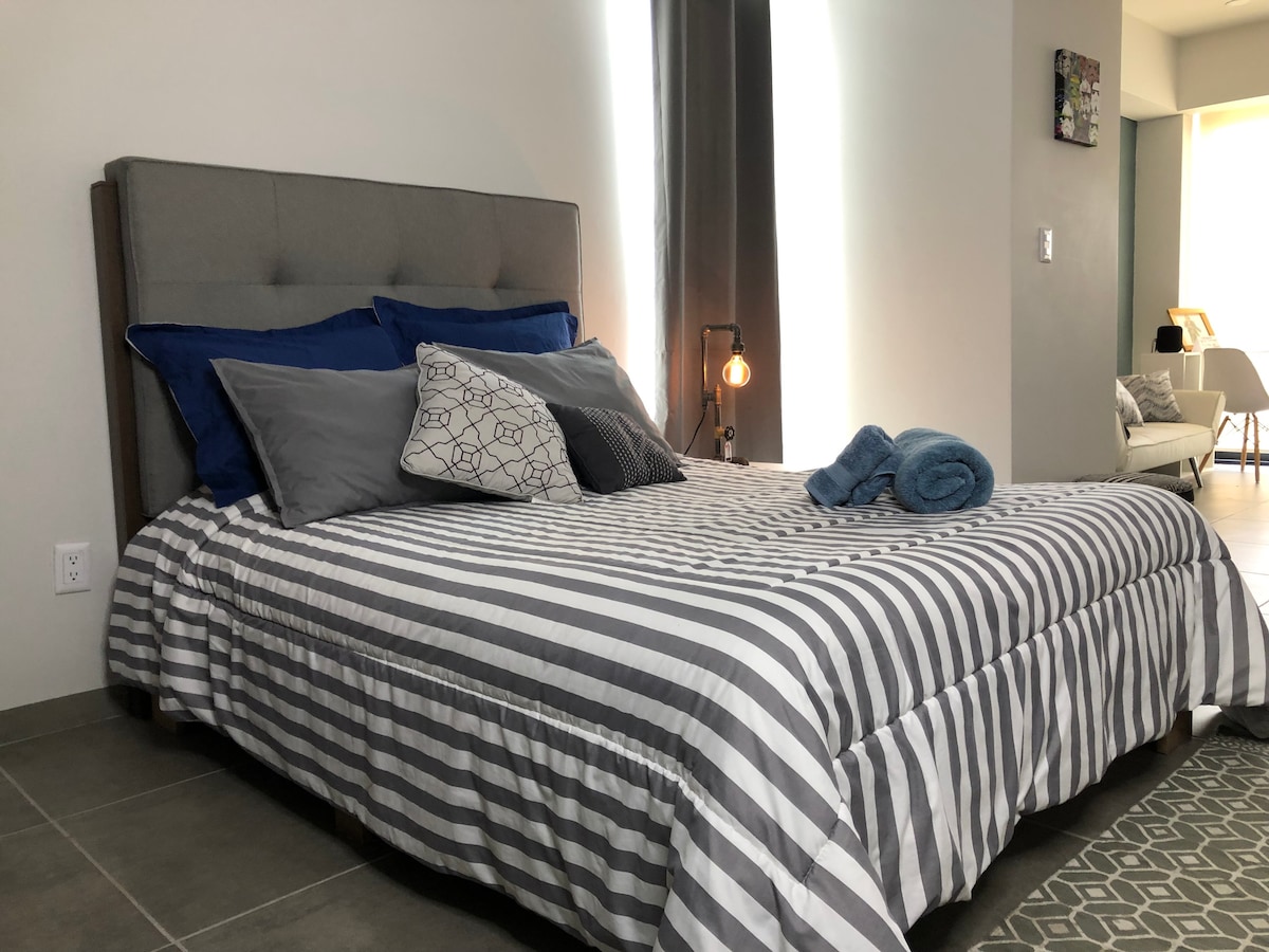 Exclusieve loft op Blvd. Landelijk in Naran, Lion 's Gto Diamond Zone. Het is perfect voor romantische uitstapjes, afgelegen werk en Largas-verblijven. in de buurt van Plaza Mayor, Parque Metropolitano, evenals de beste rust. en bars van de stad, je hebt airconditioning, wifi, wifi, wifi, kingsize bed, tvsmart, bureau, keuken, slaapbank, groot terras met woonkamer, eetkamer en barbecue buiten, met de beste coworking-ruimte, paddle tennisbaan, Ludoteca en privéparkeergelegenheid, bedekt met 24/7 beveiliging.