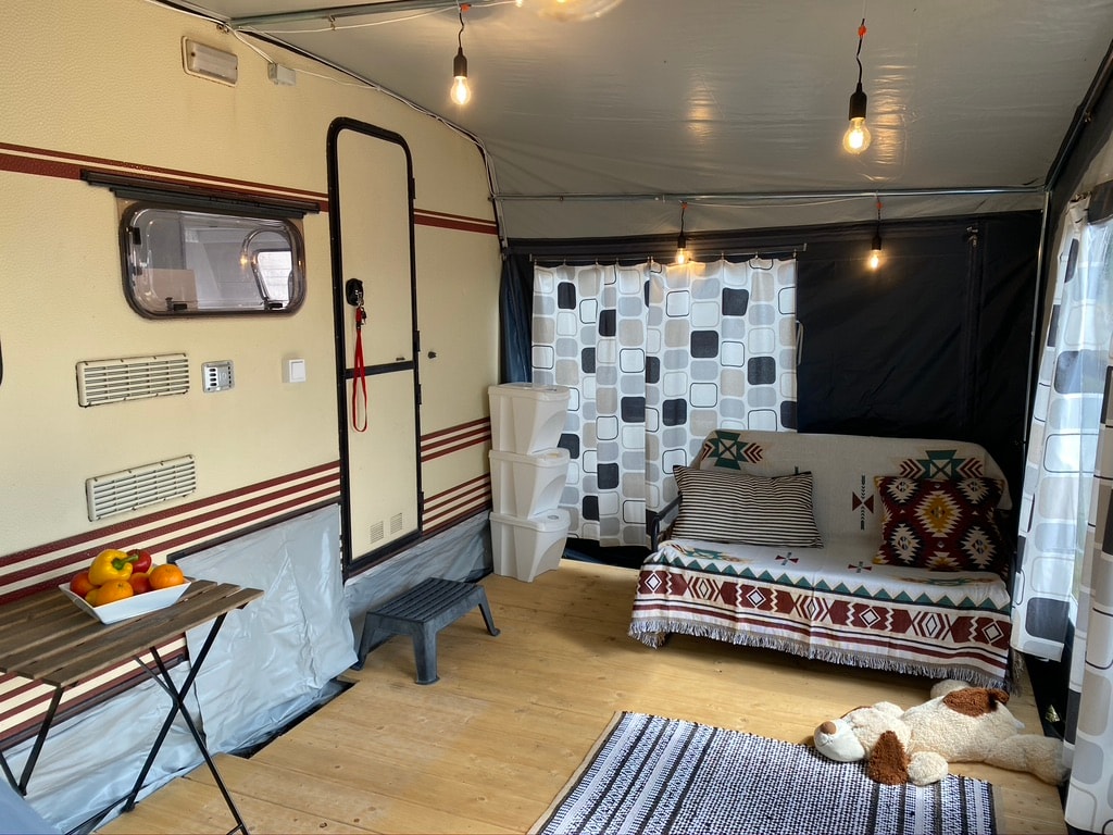 Wij bieden onze seizoensgebonden uitvalsbasis voor uitstapjes naar de zee bij Ekolaguna Camping in Cottages. Dit is een goed onderhouden Dethleffs trailer met een vestibule op een houten overloop, op de tweede rij van de baai, door een super open plek, en een mooi klein zandstrand met een plek om de hutten op te nemen/te landen. Alles is goed uitgerust en esthetisch aangenaam +wifi. Schoon, leuk en in een geweldige buurt ;-) Comfortabele douches, wasruimte, toilet bevinden zich in het centrum van de camping. Gasten zijn onderworpen aan aanvullende kampeerkosten