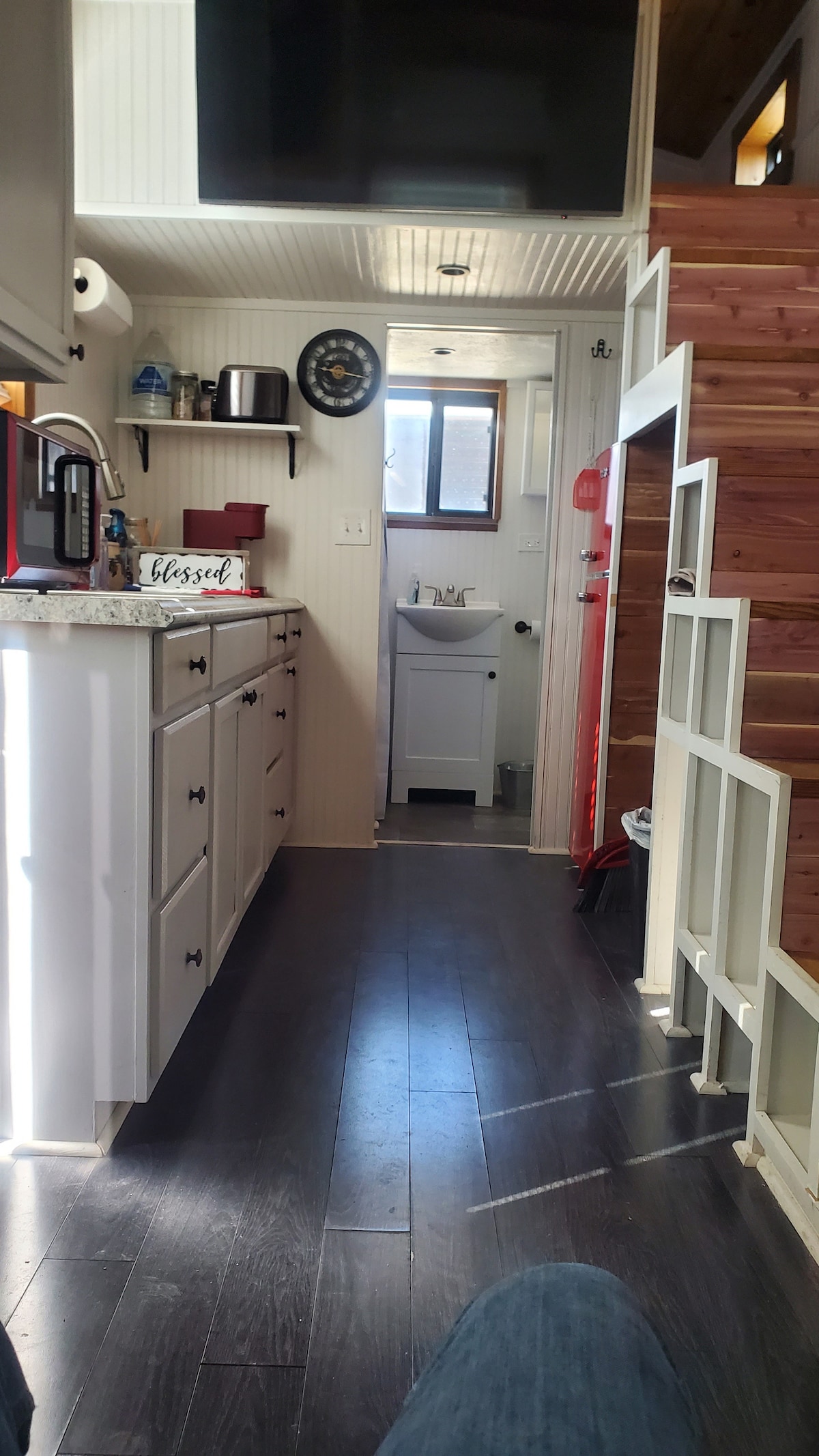 Schattig klein rustiek tiny house op een werkende paardenboerderij. We hebben kraampjes voor het instappen als je tijdens het reizen een tussenstop nodig hebt. We hebben geen paarden te huur, omdat dit een privéfaciliteit is. We hebben beschermhonden, kippen, guineas, pauwen, paarden en vee, dus er zullen boerderijgeluiden zijn, maar meestal erg rustig. We liggen op slechts 12 mijl van Denton met veel winkels en hogescholen. 45 minuten van DFW en 40 minuten van Fort Worth en 50 minuten van WinStar