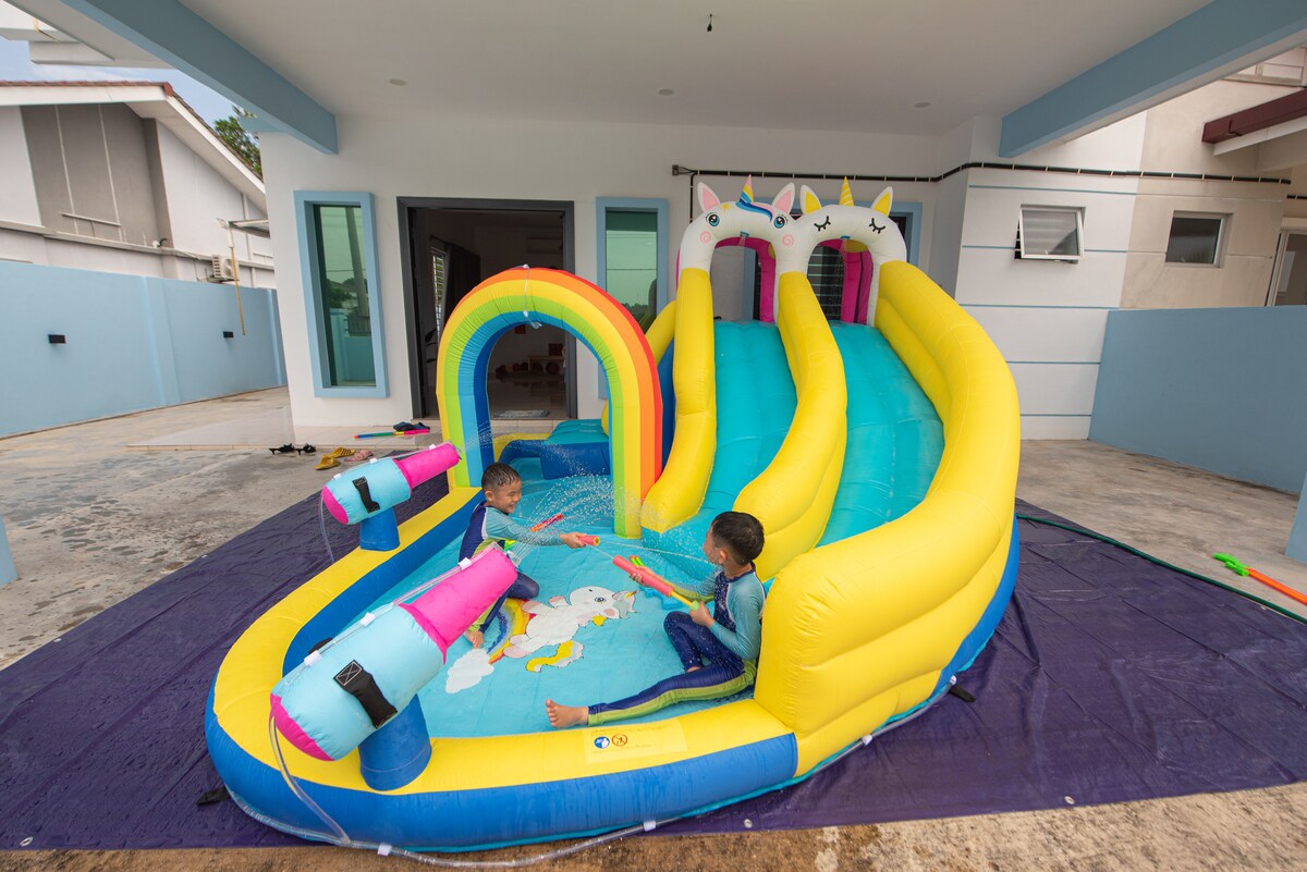 Geschikt voor maximaal 13 personen (Kan extra 2 personen toevoegen tegen een toeslag, in totaal 15 personen) Opblaasbare uitsmijterglijbaan De beroemde Pantai Cahaya Negeri ligt op 5 minuten afstand Snelle WIFI 60 inch tv met tv-box Ruime parkeerplaatsen (5-6 auto 's) Stil buurt PUSASDA & Museum Tentera Darat ligt op 5 minuten afstand