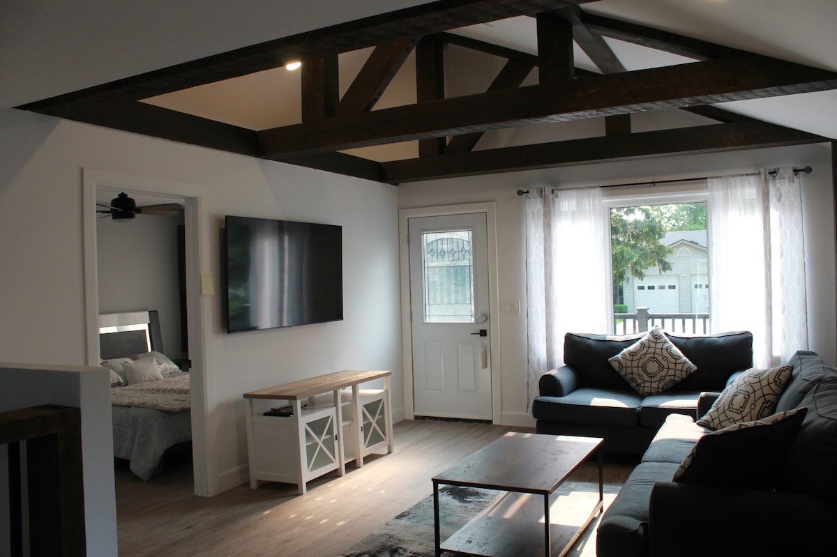 Luna Vibes Delight is een rustig en stijlvol toevluchtsoord, perfect om te ontspannen in het hart van Lambton Shores. Slechts een klein eindje rijden naar stranden, wijngaarden, markten en golfbanen, met een toegankelijke bootsteiger op de Ausable River in onze straat. Deze woning met één verdieping heeft moderne afwerkingen en een groot, eigen terrein dat aan landbouwgrond grenst. Ontspan op het terras aan de achterkant en geniet van rustige zonsondergangen met een roze hemel in een rustige, serene omgeving.