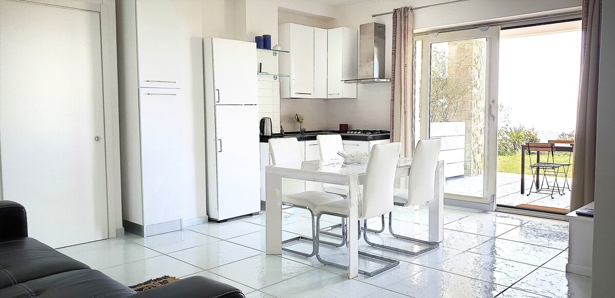 Appartement van ongeveer 80 m2 met een betoverend 180° zeezicht, zorgvuldig ingericht en ingericht om je het gevoel van echt thuis te zijn. De ruimtes zijn groot, licht en verdeeld in: twee slaapkamers, keuken met woonkamer, complete badkamer, servicebadkamer, gemeubileerd terras. Villa Bellavista is de ideale plek om te genieten van de zon en de zee en om de vele schoonheden van het Nationaal Park Cilento te ontdekken.
