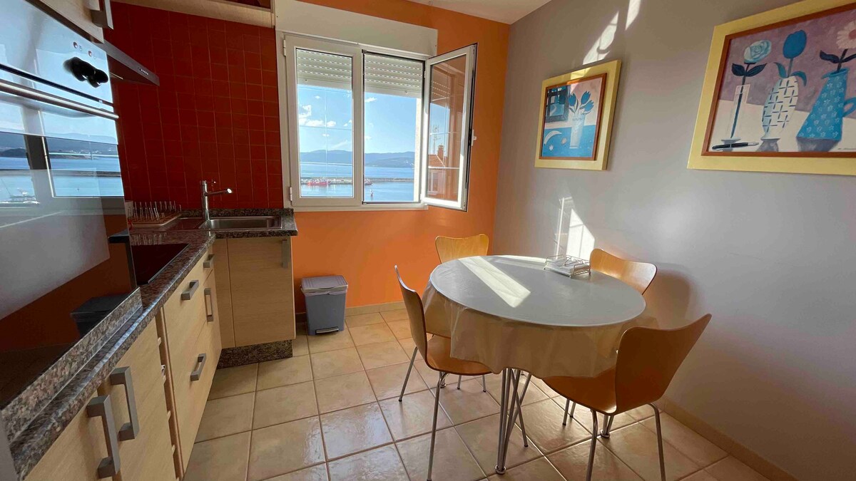 "Ervaar luxe aan het strand in ons onlangs gerenoveerde appartement, met een prachtig uitzicht op zee vanuit alle slaapkamers en de woonkamer. Volledig uitgerust voor een onvergetelijke strandvakantie, het biedt airconditioning, 3 ruime slaapkamers met kasten, 2 badkamers met bad (een eigen badkamer) en een onlangs gerenoveerde aparte keuken. Portosín, een charmant vissersdorp, nodigt je uit om te ontspannen op de witte zandstranden en te genieten van gastronomische geneugten in de restaurants van de haven.