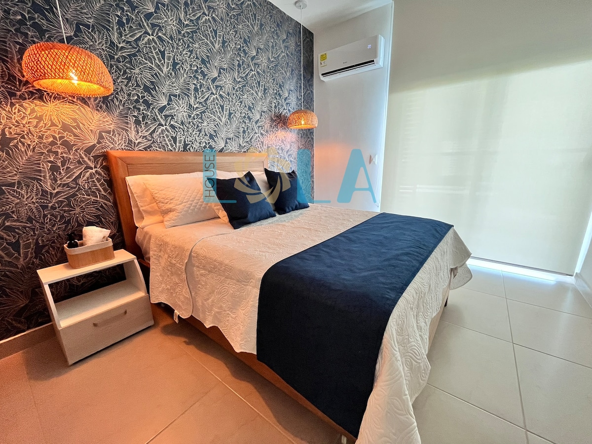Disfruta tu estadía en una zona privilegiada, con vista lateral al mar y excelentes comodidades. Este espacio esta pensado para quienes buscan tranquilidad y una ubicación estratégica. Una escapada romántica o viajes de negocios. Apartaestudio totalmente amoblado y decorado con estilo playero, aire acondicionado wifi de alta velocidad y TV, cocina equipada con nevera, estufa, utensilios, baño privado, 3 piscinas, jacuzzis, terraza con vista al mar, GYM, a tres minutos de playa, mall plaza vecino