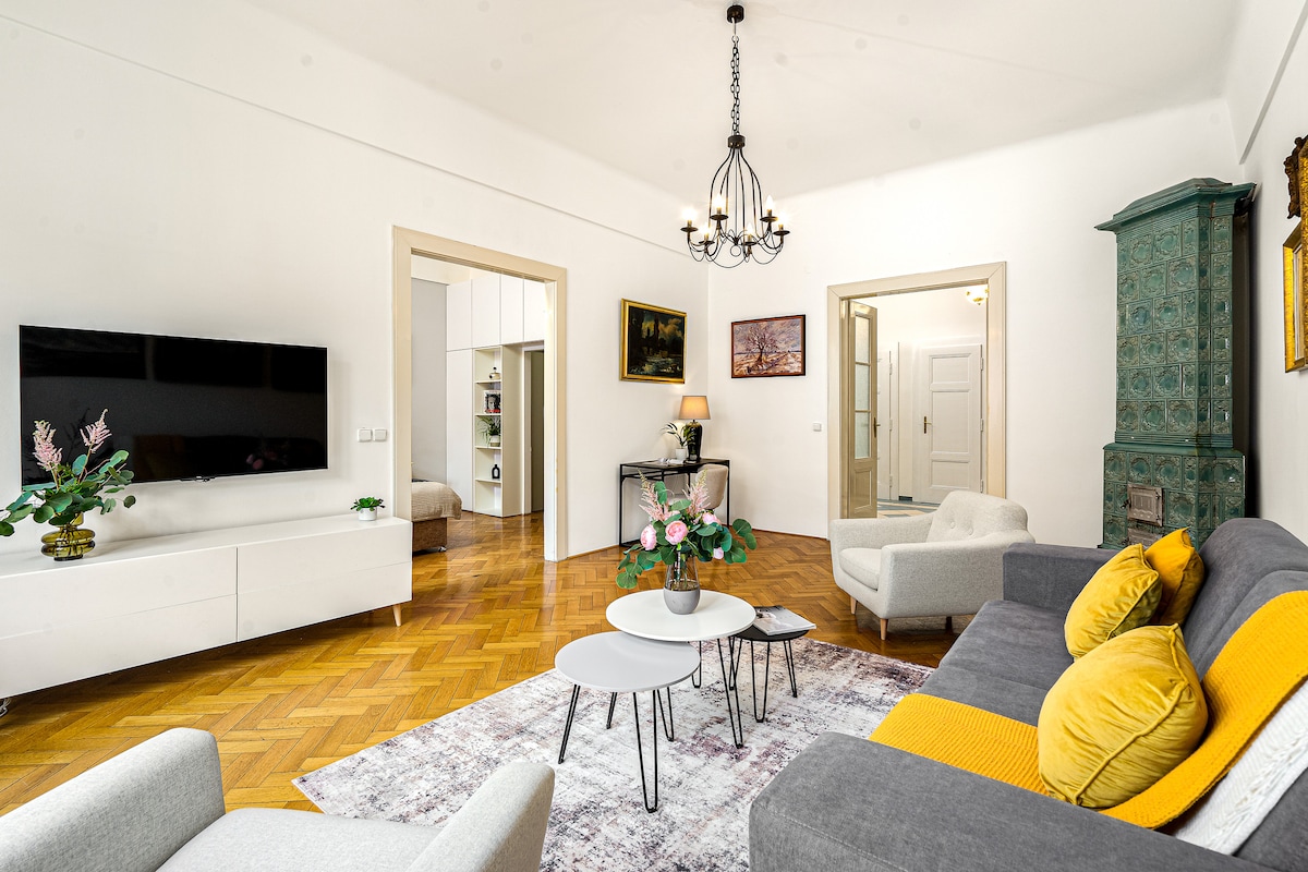 Welkom in je appartement, onderhouden door Praagse Dagen • Perfect gelegen in het hart van de oude binnenstad van Praag, naast de Spaanse Synagoge en op vijf minuten van het iconische Oude Stadsplein • Elegante meubels en inrichting • Voelt ruim en uitgerust met snelle wifi (70mb), een bureau, een tv met Netflix en een klein balkon • Het met zorg ingerichte appartement is geschikt voor vier gasten in 1 slaapkamer en een grote slaapbank.