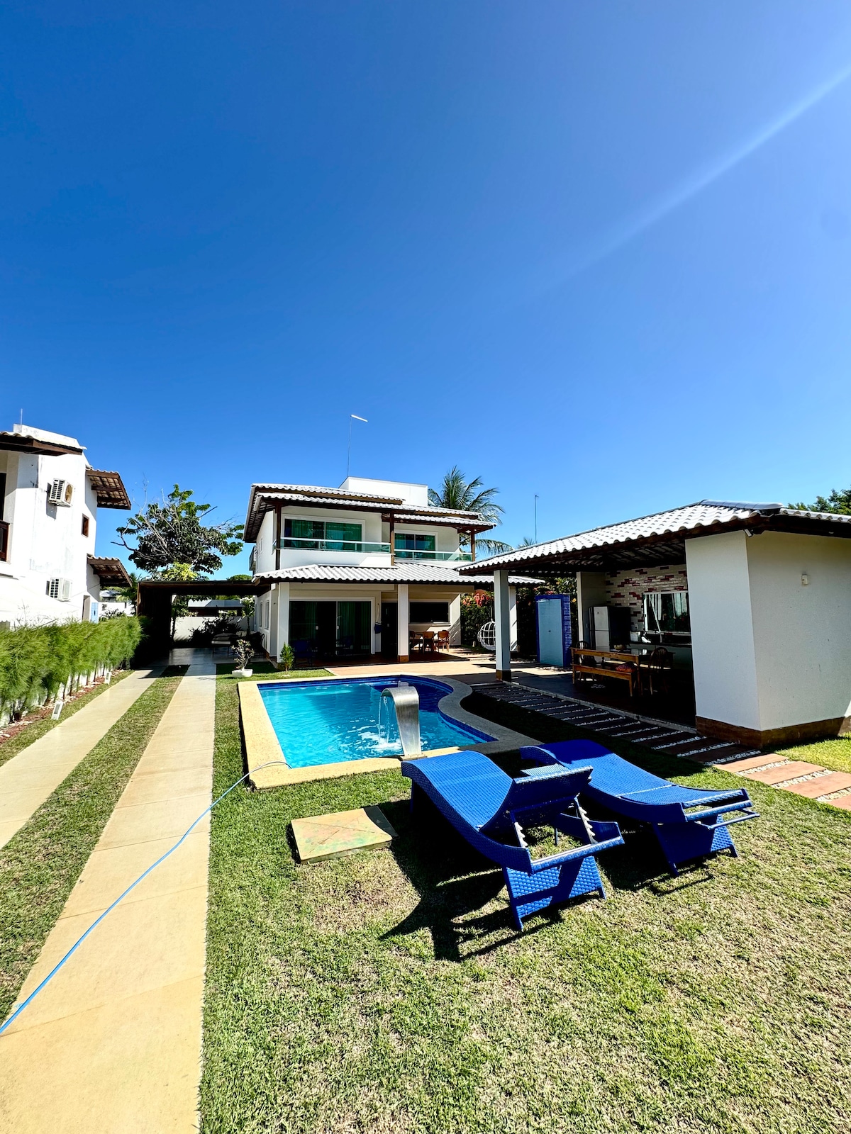Huis 2 minuten lopen naar een strand met blauwe vlag; 158 m 5 en-suites met airconditioning, kasten en 100% verduistering voor 10 personen (4 tweepersoonsbedden en 2 eenpersoonsbedden) Zwembad, BBQ, tuin, vaatwasser Dagelijkse schoonmaak van het zwembad en het huis inbegrepen, behalve op zondag HS Internet 500 mb Communitybeveiliging met camera's en 24/7 patrouille; toegang tot het huis bewaakt Fietspad met uitzicht op de oceaan, sportvelden Maximaal tien gasten ouder dan twee jaar Energie- en waterverbruik gedekt tot R$ 40/dag. Het eigen risico wordt bij het afrekenen in rekening gebracht.